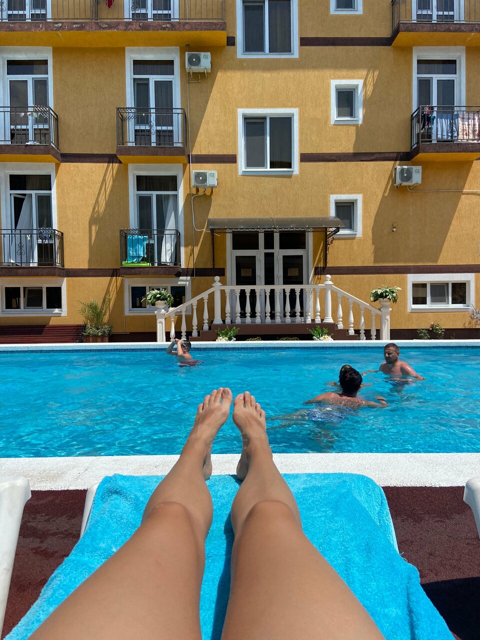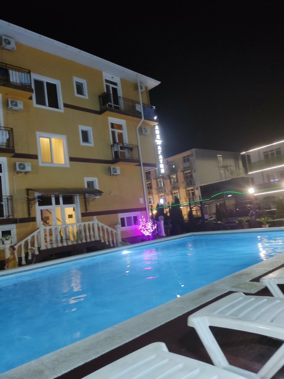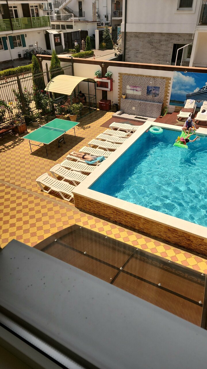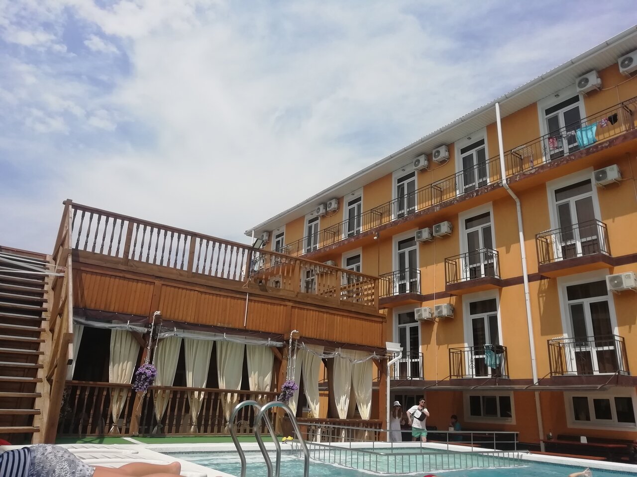 Хороший отель, недалеко от моря ,прекрасная столовая вкусно по домашнему, чисто,большой басик.Трансфер с вокзала 500руб(чемоданы тянули сами мама и ребенок)встретили на парковке.в отеле высокая лестница и там сами тащили свои чемоданы.и если хотите поспать музыка долбит на басах с 8.30-до23.00.иногда уменьшают.Тусить всем сюда.