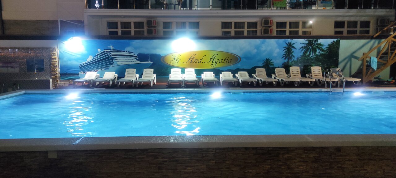 Отдыхали в отеле Grand Agatia с семьей с 17.07.20.-26.0720..Отель очень понравился.Отличное место для отдыха с детьми.Хорошие,уютные номера.,бассейн с детской зоной для купания,веранда где можно позагорать.Отдельно хочется отметить вкусное питание в столовой ,которая находится на территории отеля.Еще на территории есть игровая площадка для детей,зона для курения и большая парковка под зданием отеля.Пляж находится в 10 минутах ходьбы по тенистой аллее,пляж очень чистый и ухоженный,мелкий,теплый песочек.В целом отель оставил очень хорошее впечатление,куда хочется вернуться.