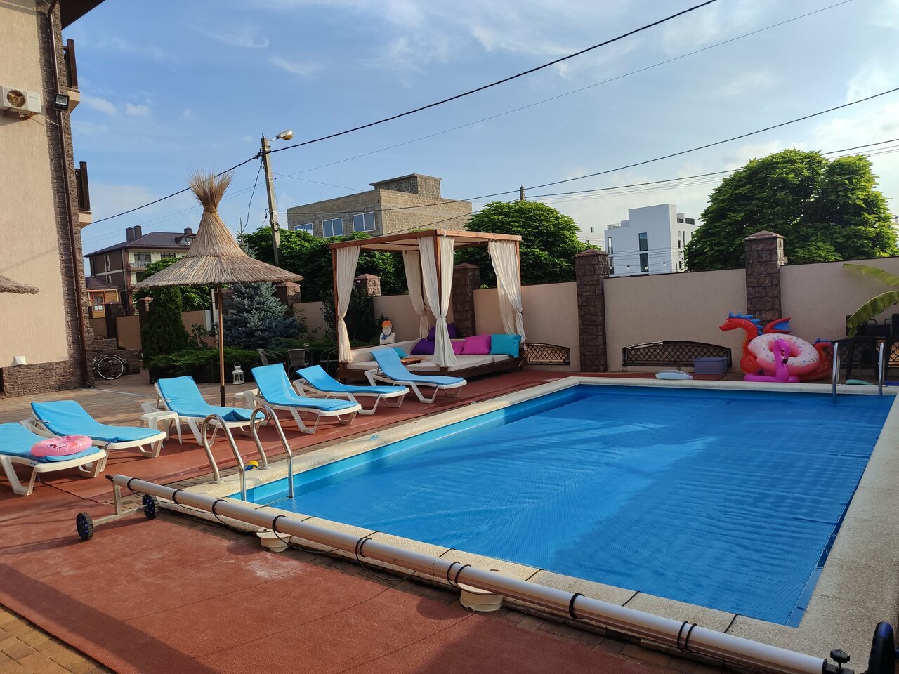 Отлично отдохнули в этом гостевом доме. Чистые и уютные номера, уборка без нареканий. В трёхместном номере для одного ребенка была небольшая кроватка, второй спал на раскладном диванчике. На цокольном этаже общая кухня-гостиная, есть все необходимое, чтобы приготовить еду самим, общие холодильники (помимо мини-холодильника в номере). За дополнительную плату можно заказать, чтобы еду вам приготовили. Территория дома частично под крышей, что очень удобно на случай непогоды. Отличная мангальная зона, можно самим готовить на огне. Есть уголок для спортсменов, батут, детская площадка. Бассейн и шезлонги чистые, приятно провести время под солнышком. Обязательно отмечу, что хозяин не просто проявляет радушие, но и внимателен к каждому постояльцу. Рядом с домом парковка, проблем поставить машину не было ни разу. В шаговой доступности столовая, небольшой магазин, пекарня. До моря можно дойти пешком, недалеко Пионерский проспект. Общее впечатление от нашего отдыха отличное, рекомендуем!