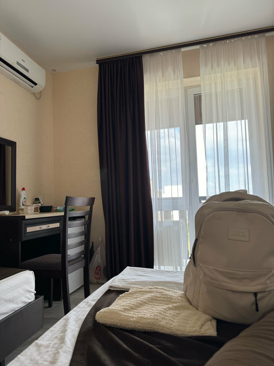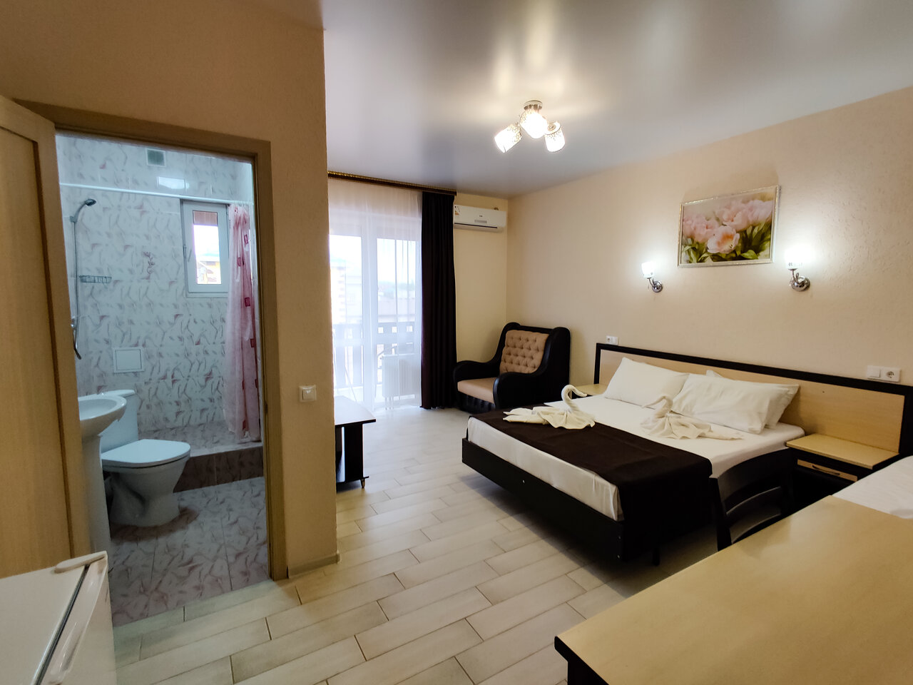 Уютный светлый номер с одной двуспальной, односпальной и креслом-кроватью. Выход на балкон с видом на бассейн, улицу или двор.