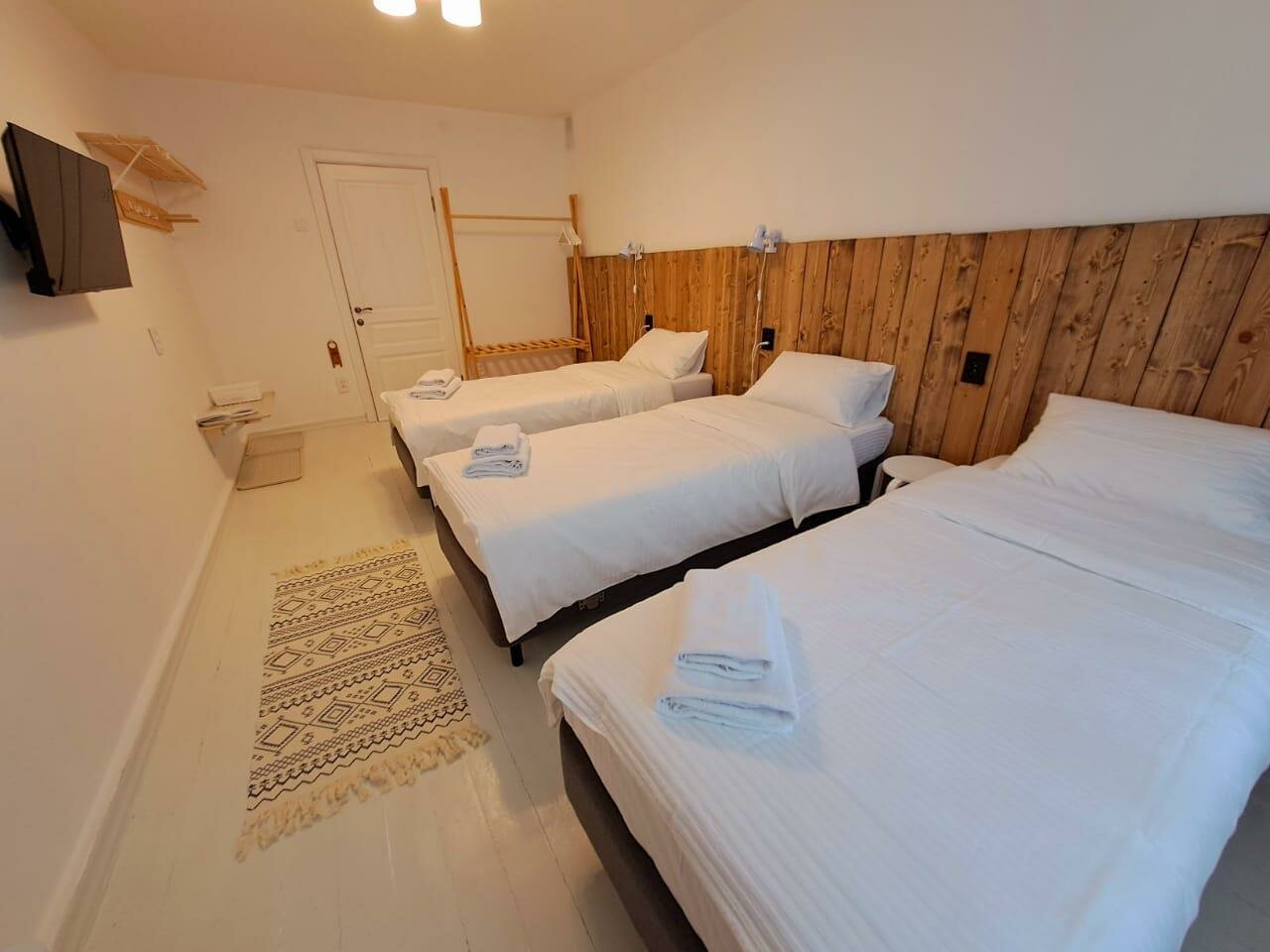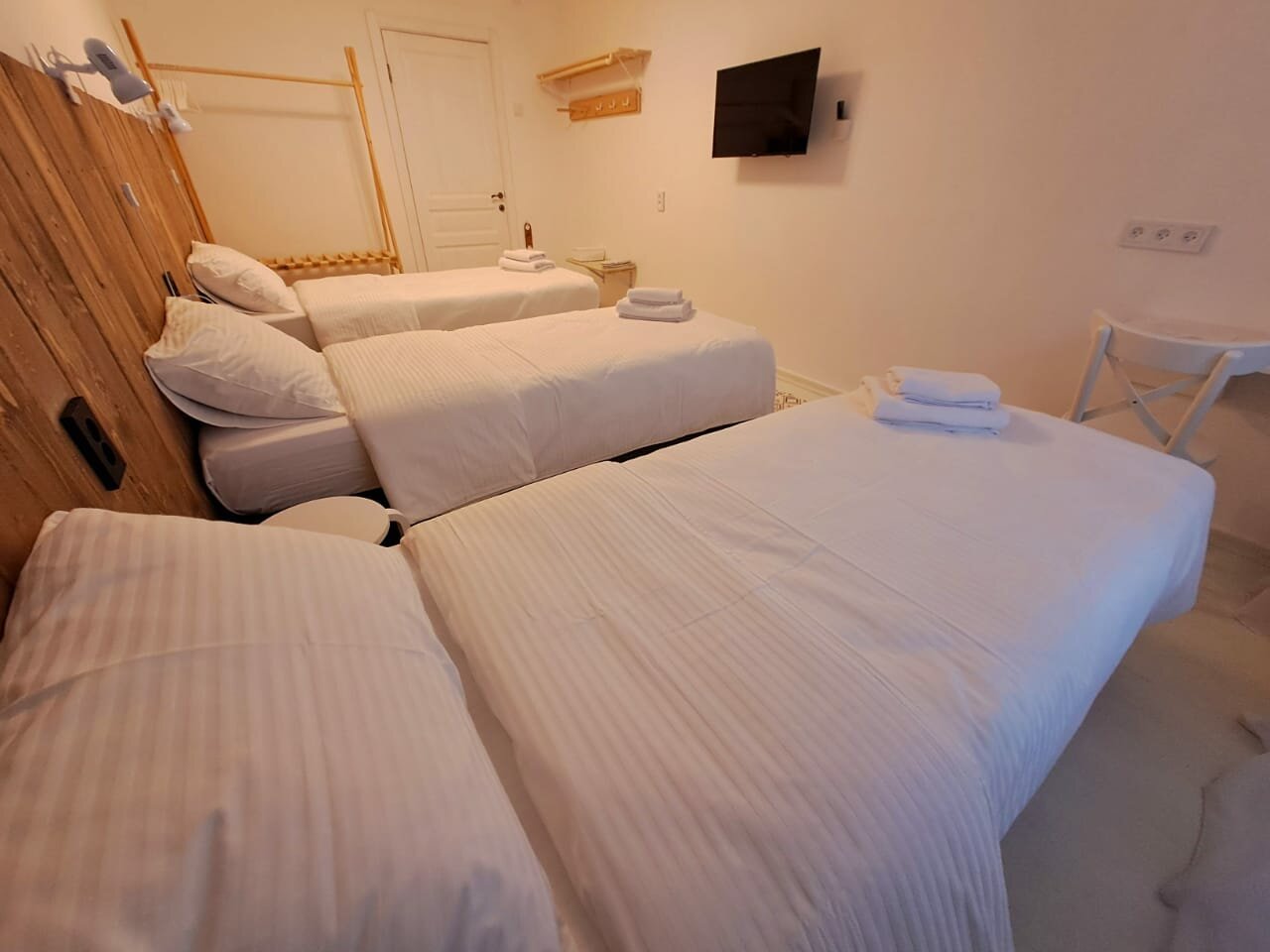 В 5-и местном номере три кровати: полуторная,двухспальная кровать, двухспальный диван,телевизор,стол,посуда,душ,туалет. Без окна