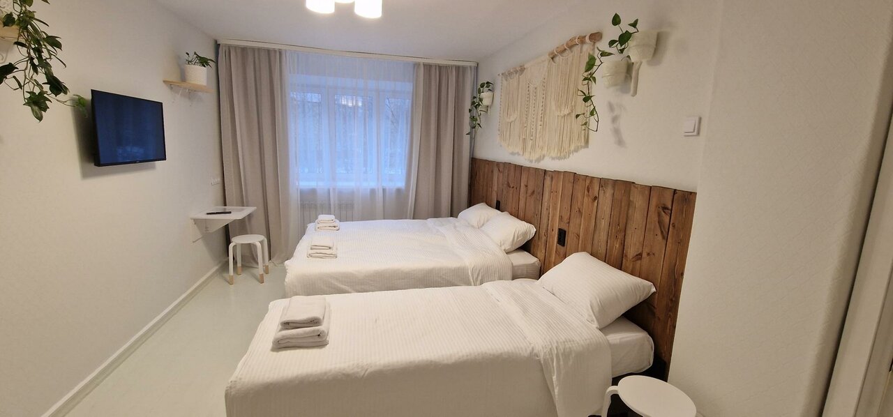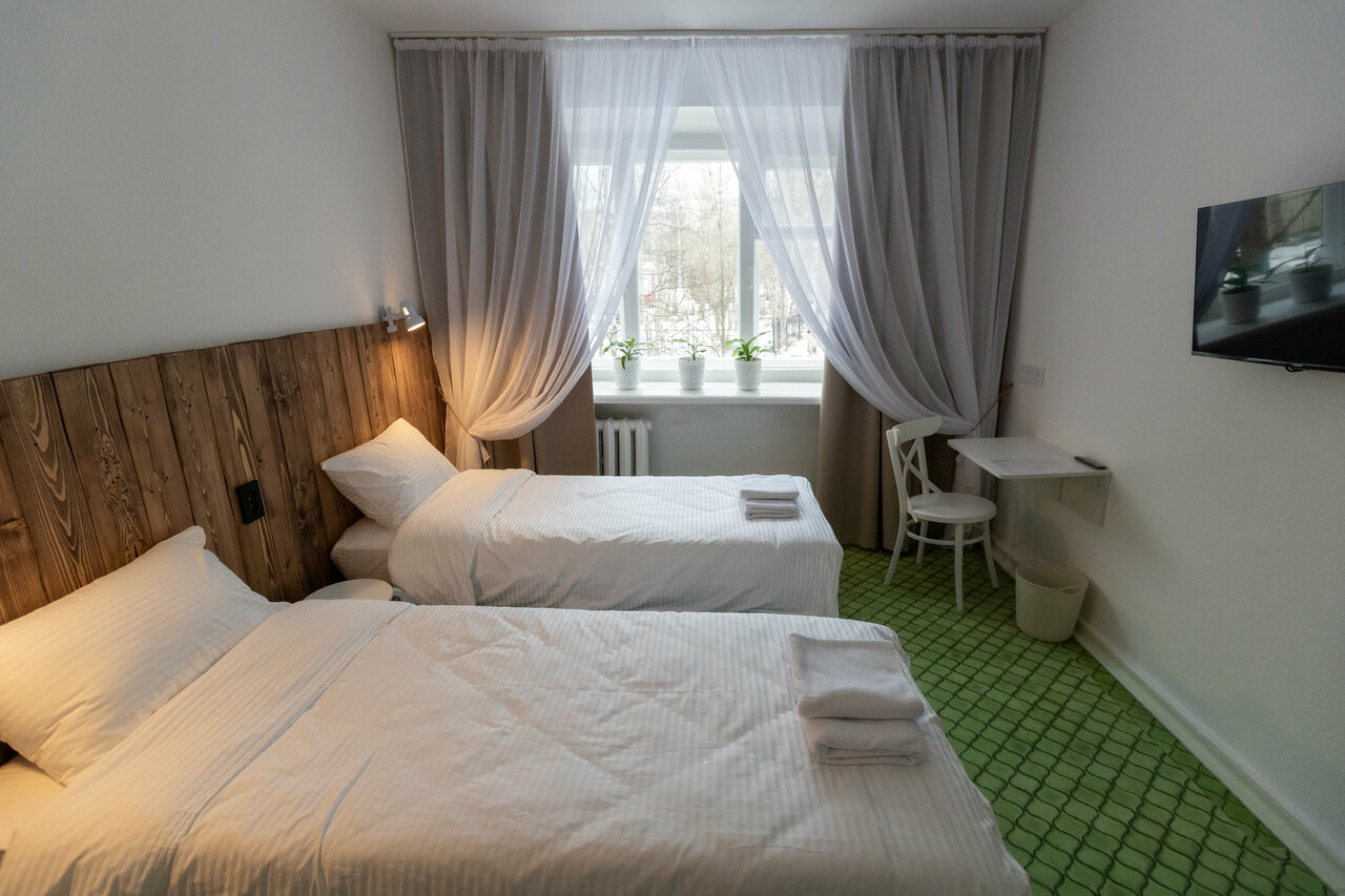 уютный 2-х местный номер с удобствами. В номере: 2-спальная кровать, телевизор, холодильник, эл.чайник, посуда, с/у с душевой кабиной (или ванной), полотенца, тапки, туалетные принадлежности. Wi-Fi