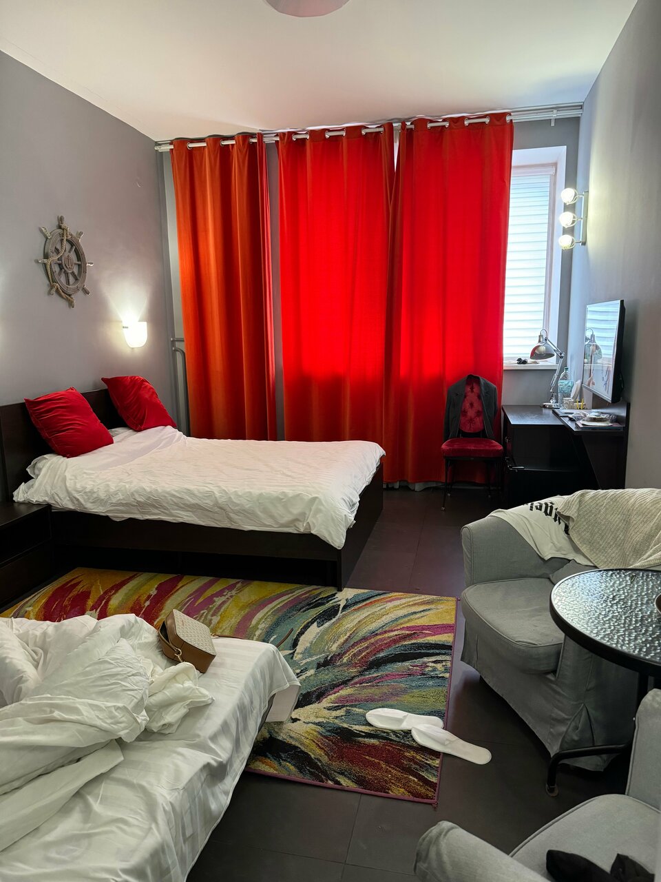 Удобное местоположение, чисто, комфортно, на первом этаже многоквартирного дома. Есть своя парковка. Дают с собой завтраки))