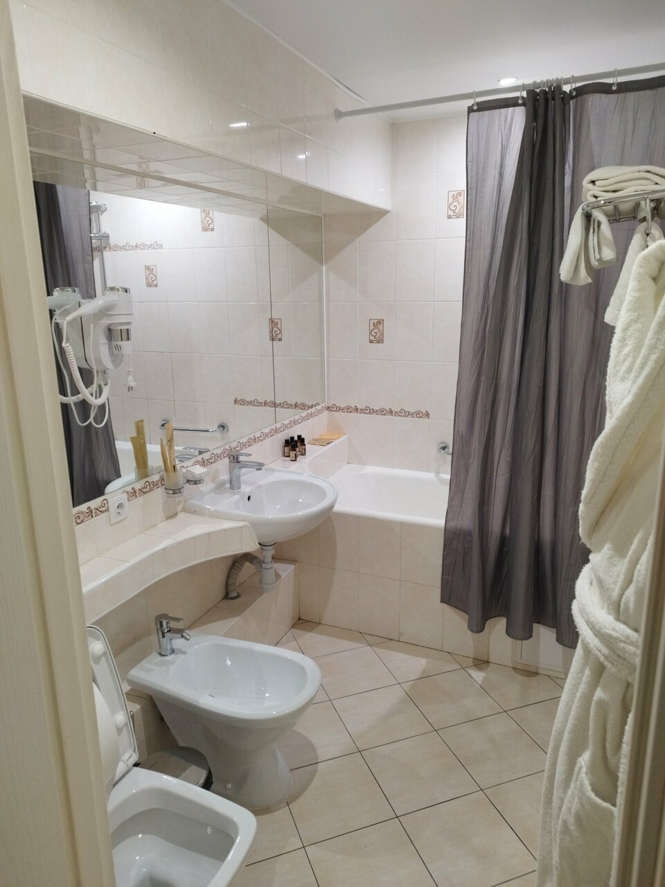Хороший отель. Номер у меня был полулюкс — большой, светлый, комфортный. Даже с маленькой комнаткой с доской для глажения! Расположен не в самом центре, но и недалеко. Завтраки — на выбор, на один из трёх вариантов. Не самый лучший, но достаточно сытно. Хороший отель на 4 звезды.