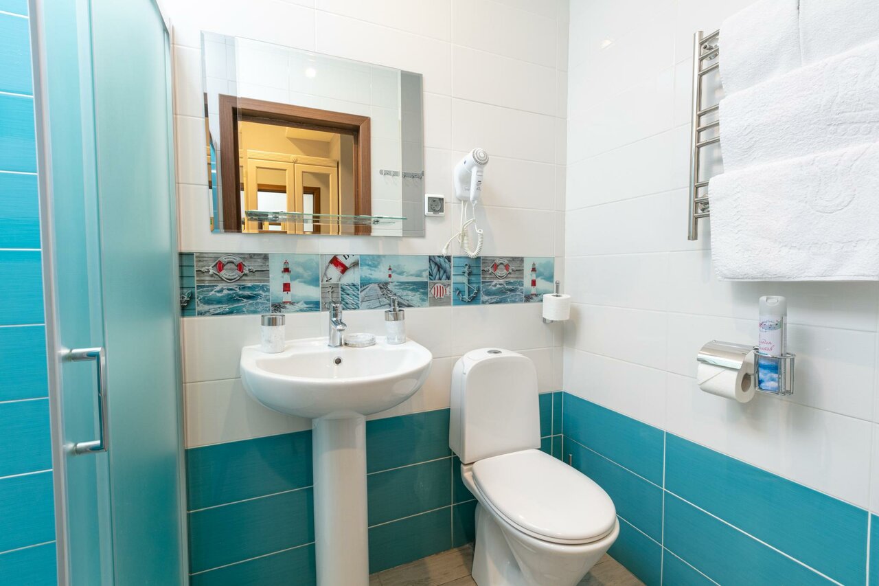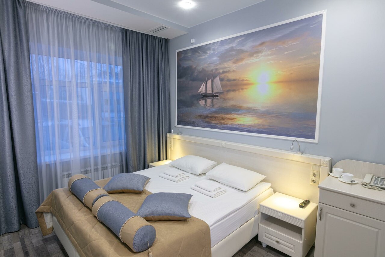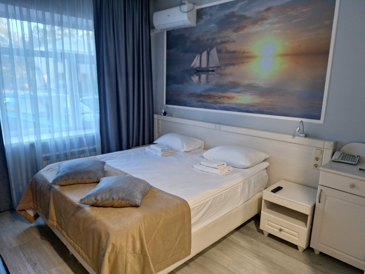 Очень приятная гостиница. Доброжелательные администраторы, очень чисто в номере. Есть куллер с водой на этажах. Вайфай работает хорошо. В номере есть всё необходимое — холодильник, фен, тапочки и тд. Единственный момент — подушки очень высокие, мне было не удобно спать, а запасной в номере не было. В санузеле всё работало исправно, есть электрическая сушилка (высушила вещи после дождя за пару часов). При отеле есть кафе, где можно позавтракать и поужинать. Набережная в 5 минутах ходьбы. Парковка около отеля машин на 5, но запарковаться рядом не составит труда.