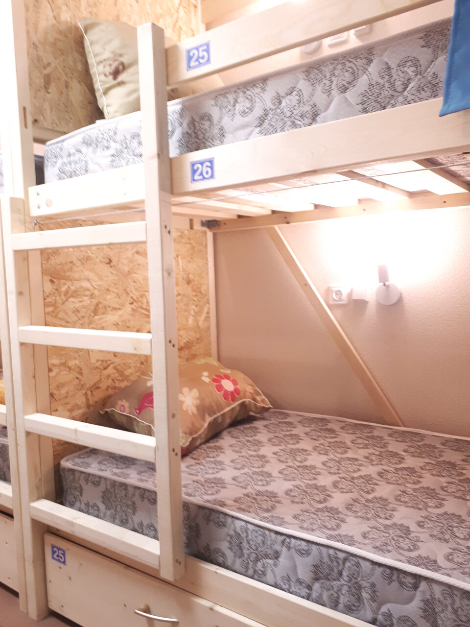 Он находится в центре города, что удобно. В номере двухъярусные кровати, у каждой из которых светильник, розетка для зарядки и ящики для хранения. Вешалка для одежды общая. Каждая кровать закрывается шторкой, что очень удобно, если вы в номере не одни. Это все плюсы данного хостела. Минусы вы можете увидеть на фото. Находится он на 4 этаже. Придётся подниматься с чемоданом, так как лифта здесь нет. Также везде грязь, ужасный запах, и неблагоприятный контингент. Если не хотите испортить впечатление об этом прекрасном городе Архангельске, не советую здесь останавливаться.