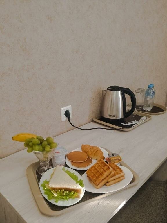 - Бронь по телефону – удобно.; В номере тепло, есть чайник.; Тихо, опрятные номера, завтрак.; Вежливый персонал, готовый помочь.; Общая кухня с холодильником, чайником, микроволновкой, кофемашиной.