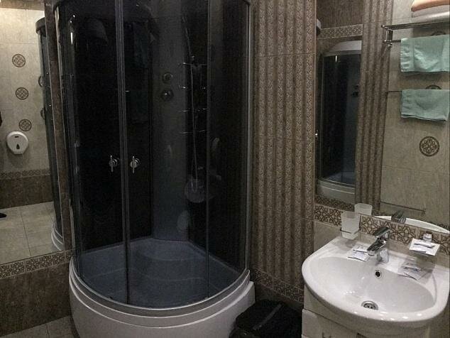 Были в гостинице 5 дней с 27 марта, в гостинице чисто, персонал доброжелательный, номер нормальный-не очень уставший,,, ванная комната чистая, душевая кабинка, фен, полотенца ( не очень белые, меняли через день), плиточка на стенах и полу чистенькая приятная! Мыло, гель для душа и шампунь предоставляют одноразовые,,,, кофе растворимый и чай в пакетиках на ресепшен-там же чайник электрический, есть микроволновка, посуда, кулер с водой,,,, в номере есть холодильник-питание в гостинице не предусмотрено, это не очень, и район деревянных домов-магазины и точки питания-далеко, утюг и доску гладильную предоставили, хорошее место за свои деньги.