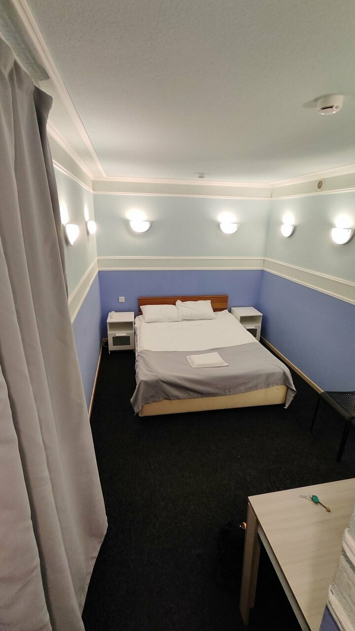 Нормальный номер ,кровать 2х спальная мяхкая,в номере есть телек,чайник,ветерок(обогреватель есть) я люблю тёплые номера ,в номере было тепло ветерок(обогреватель)не включал не разу.есть спецальная комната где стоит микравалновка и стиралка есть,для курящих в номере очень удобно есть балкон.есть душ туалет в номере.мне понравилось.расположение удобно выходиш на улицу всё в шаговой доступности