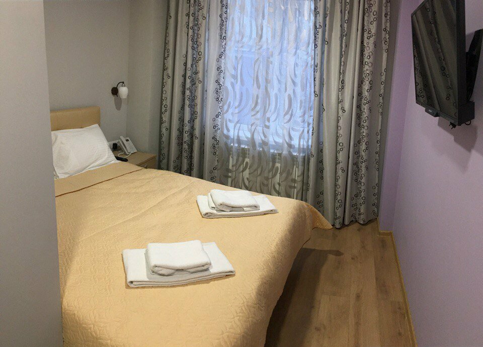 Уютный однокомнатный номер с двухспальной кроватью, двумя прикроватными тумбами и письменным столом. Номер оборудован ЖК-телевизором с доступом к кабельным каналам и бесплатной связью Wi-Fi. Санузел оснащен ванной с душем, феном.