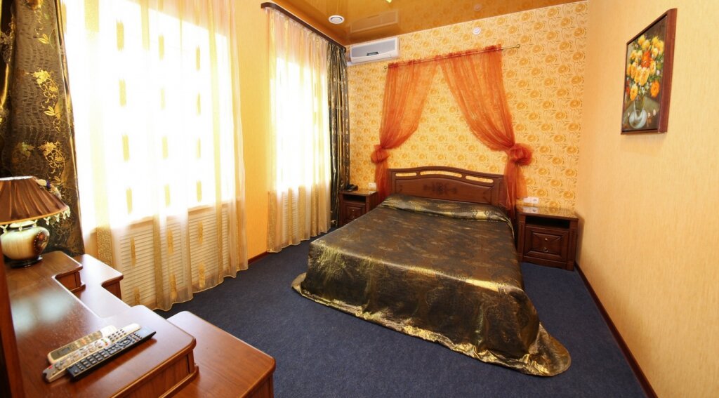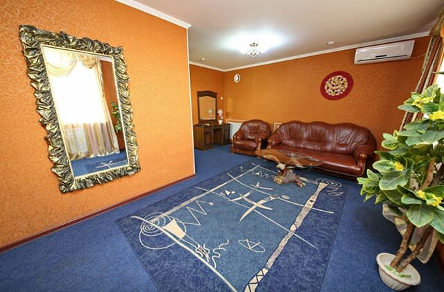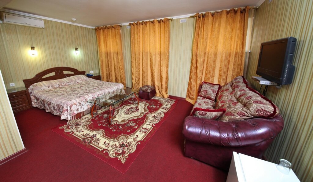 Большие номера, площадь от 20 кв. м.: двуспальная кровать, прикроватные тумбочки, большой угловой диван или диван, пуфик, журнальный столик, шкаф, ковер, декоративный камин и элементы интерьера, телевизор, кондиционер, холодильник, Интернет.