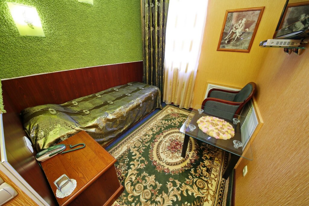 Небольшой однокомнатный номер 9 кв. м. с односпальной кроватью, в номере: журнальный стол, прикроватная тумбочка, кресло, кондиционер, городской телефон, телевизор, декоративные элементы. В ванной комнате - душевая кабина, раковина, туалет, полотенца