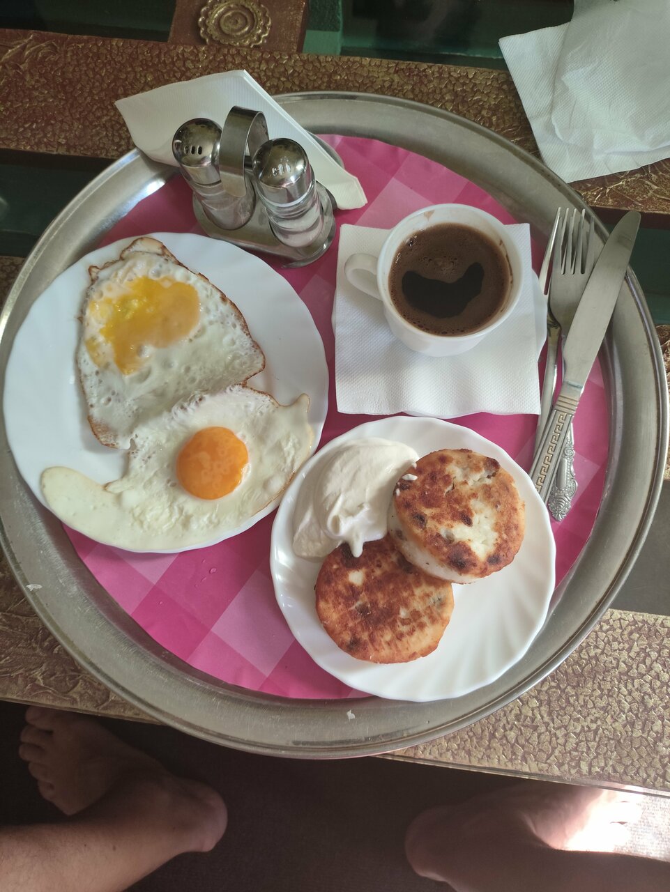 Мне понравилась гостиница. Для цены 2200 за двухместный номер очень достойное качество. Кровать с отличным матрасом, после 11 часов в машине спина хорошо отдохнула. Кондиционер работающий, чистые полотенца, мыло в дозаторах, батарея для полотенец подогревается — можно белье высушить. Сантехника чистая, никакого ‘ усталого ремонта’. В моем номере был дизайн в технике ‘декупаж’ на дверях и тумбочках.