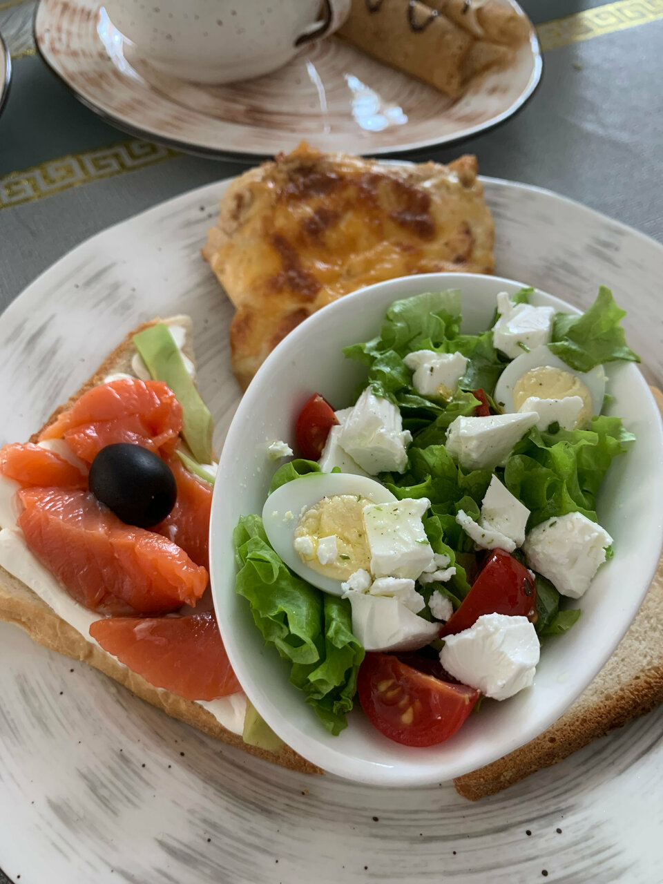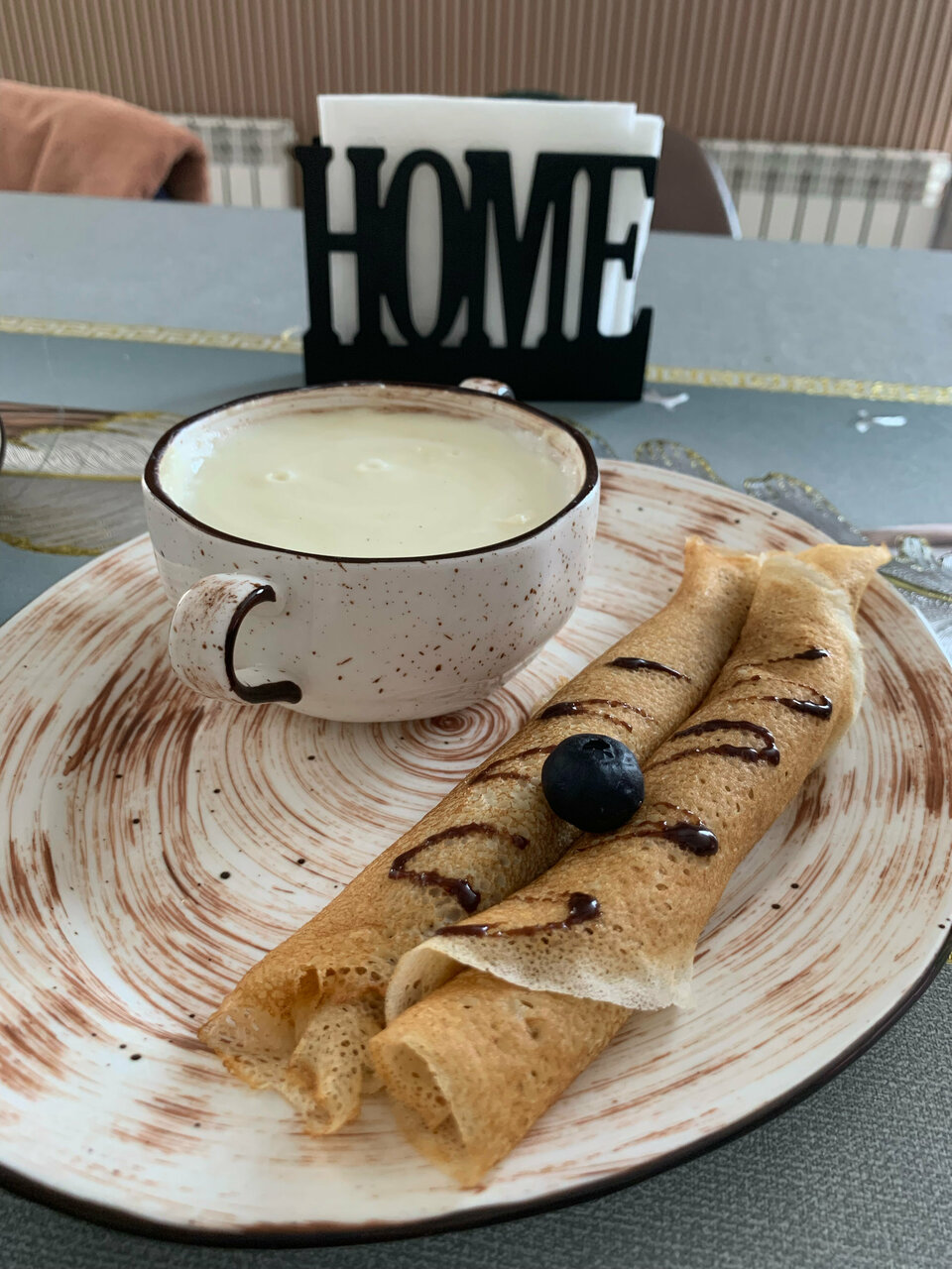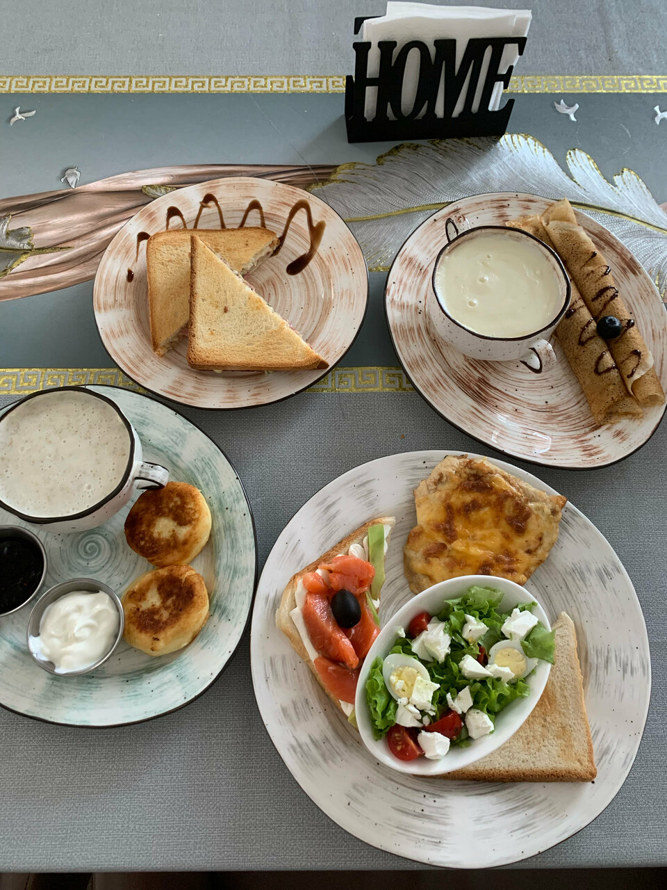 Завтрак свежеприготовленный. Яичница из двух яиц со свежими овощами и зеленью, блинчики мясом или творогом со сметаной, чай Гринфилд с сахаром.
