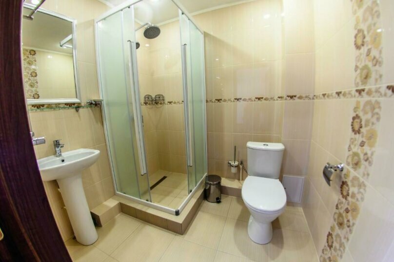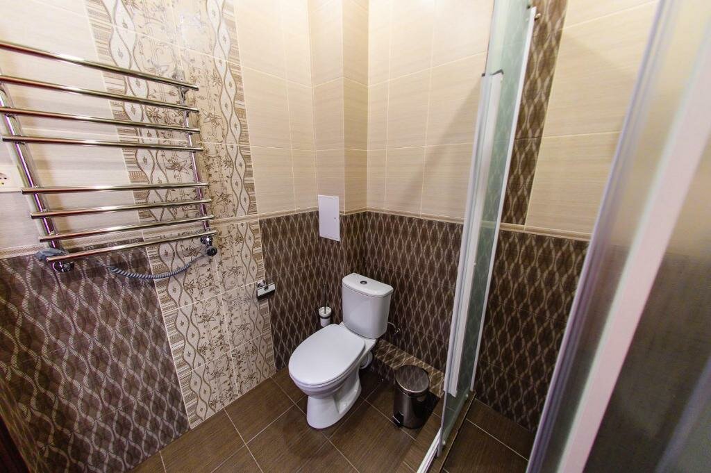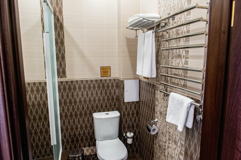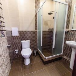 В номере душевая кабина и раковина с зеркалом .Из мебели комод для белья, прикроватная тумбочка, вешалка для верхней одежды.Туалеты на этаже.Махровые полотенца, белое постельное белье.Фен выдается по просьбе гостя.Для гостей предусмотрена