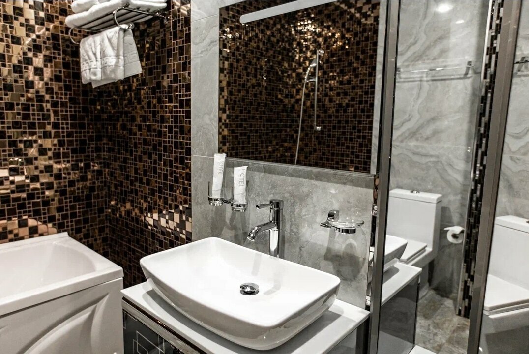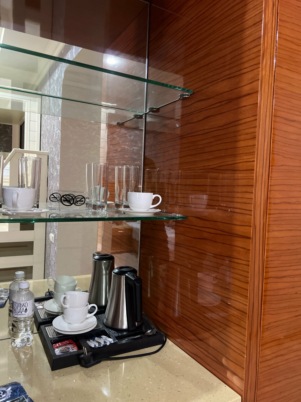 Цены выше чем у самых топовых гостиниц!Останавливался на ночь, только полу люкс был со слов девушки на ресепшене. Цена выше чем у похожих гостиниц. Номер двухместный, два халата, два комплекта полотенец, двое тапочек, а расходники только на одного (зубная щетка, мыло, шампунь, гель для душа, 1 пакетик чая…) и 1 бутылочка воды… Одна на двоих???