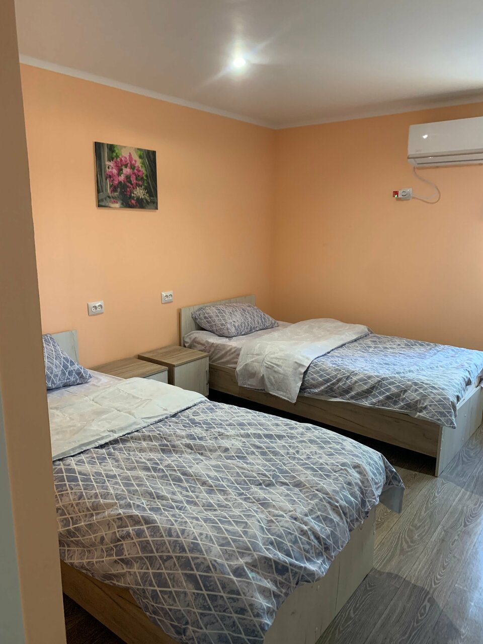 Стандартный номер с двумя кроватями. В номере кондиционер, чайник, телевизор, душевая комната с удобствами, мыльные принадлежности, тапочки, фен.