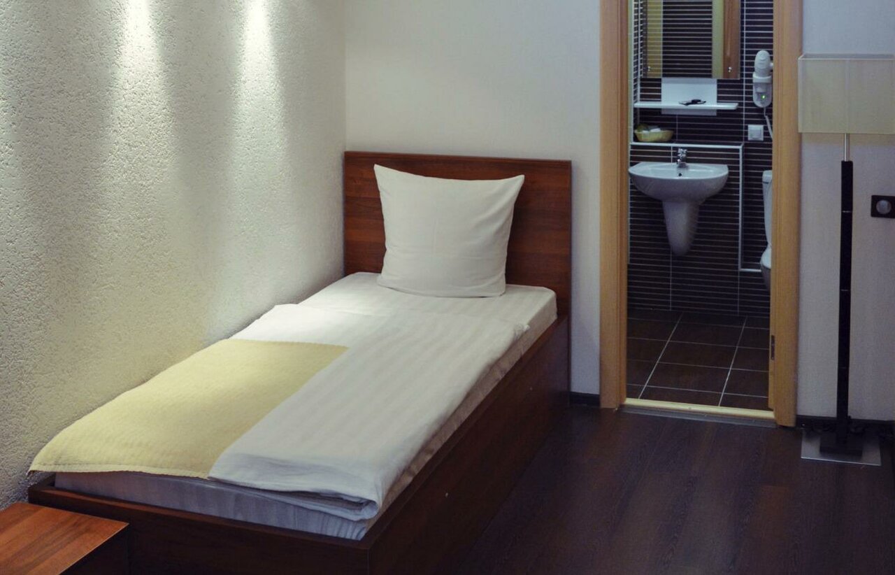 В принципе, переночевать можно. Тихо, большой номер, удобная кровать. Третий этаж здания, в котором есть еще офисы, магазин и спортцентр. Минус — нет своего ресторана или бара