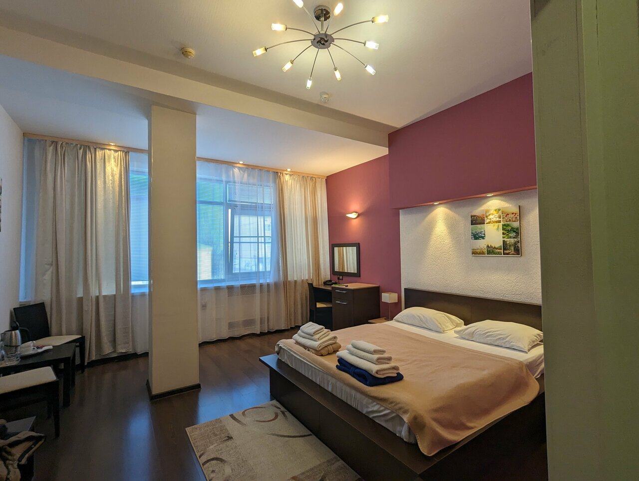 Отель средний, на 3. Номер бизнес большой, хороший, но вот все впечатление портили мелочи. Посторонние шумы от спорт зала, который находится на 2 этаже данного здания. Приходишь вечером с работы, хочется полежать, отдохнуть, а тут тебе начинается…. то как будто трубы пилят, то что то роняют, то вентиляцию включают и она гудит, как двигатель самолета. В общем если бы знала, что гостиница, это не отдельно стоящее здание, а помещение которое находится ещё куча организаций, я бы туда не стала заселяться. В следующий раз не буду останавливаться в этом отеле.