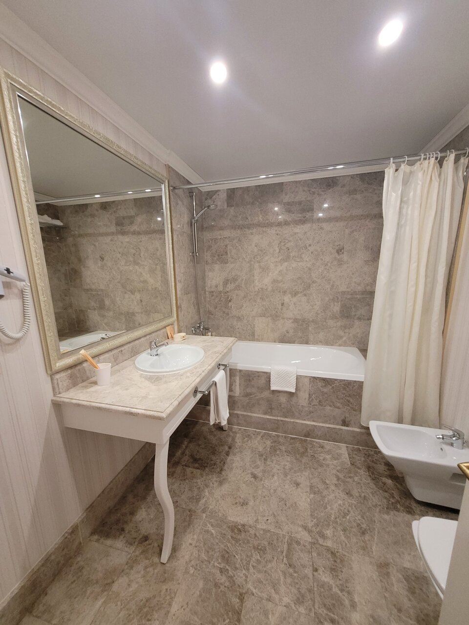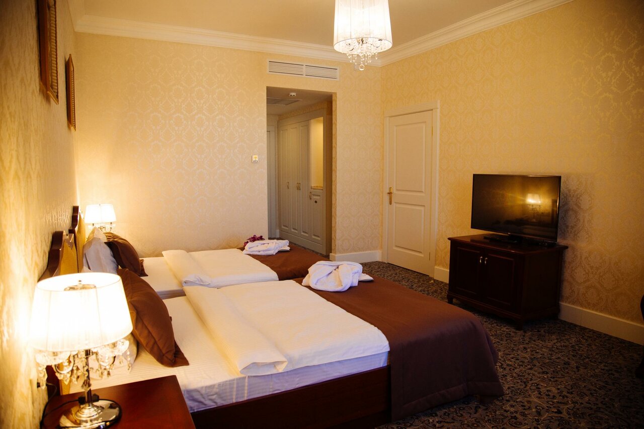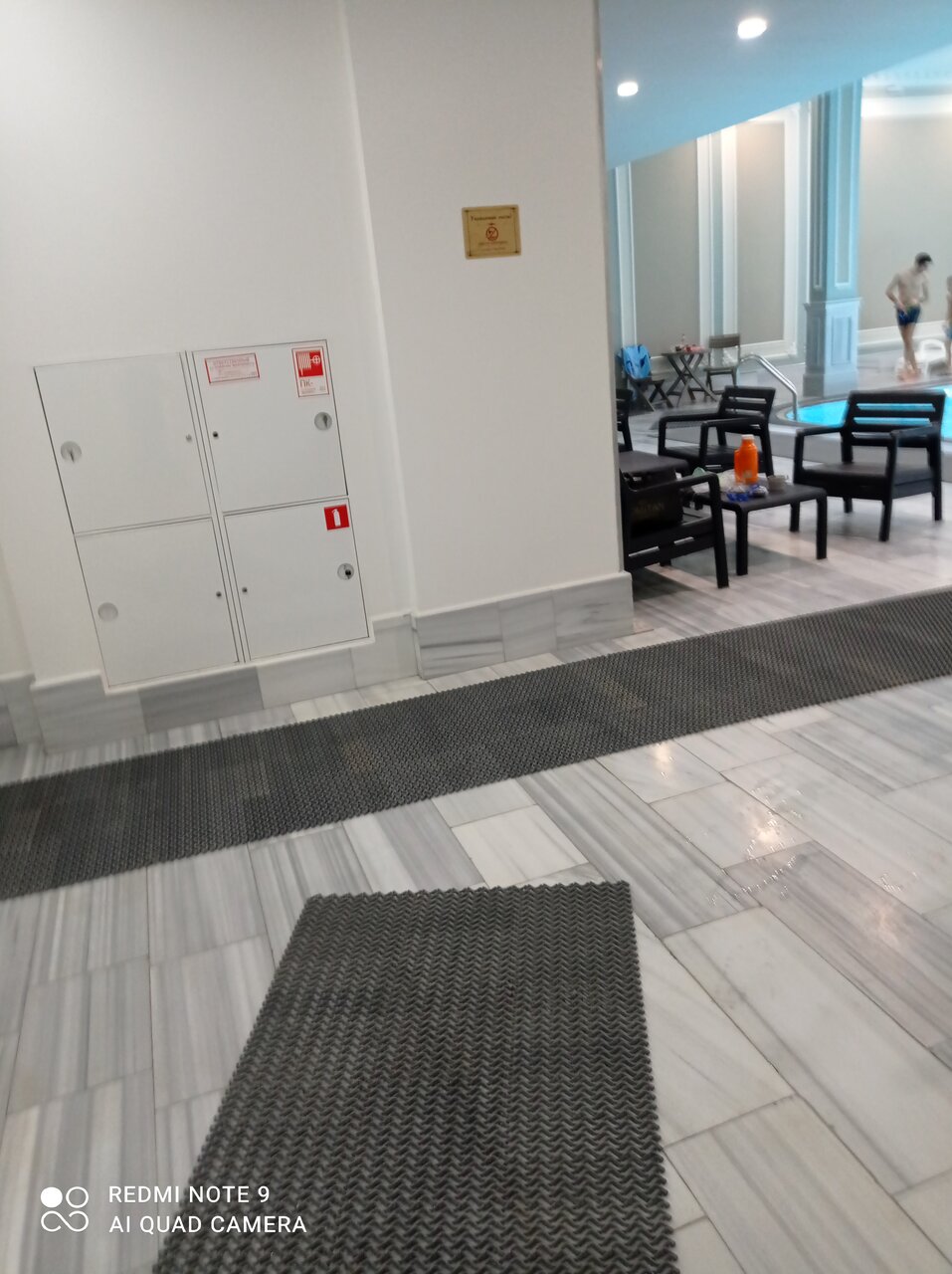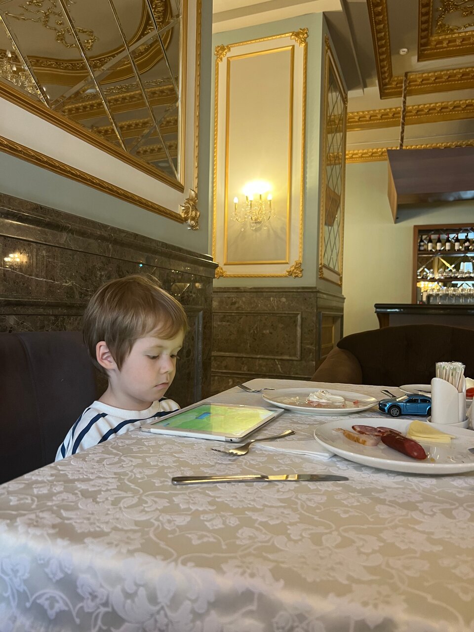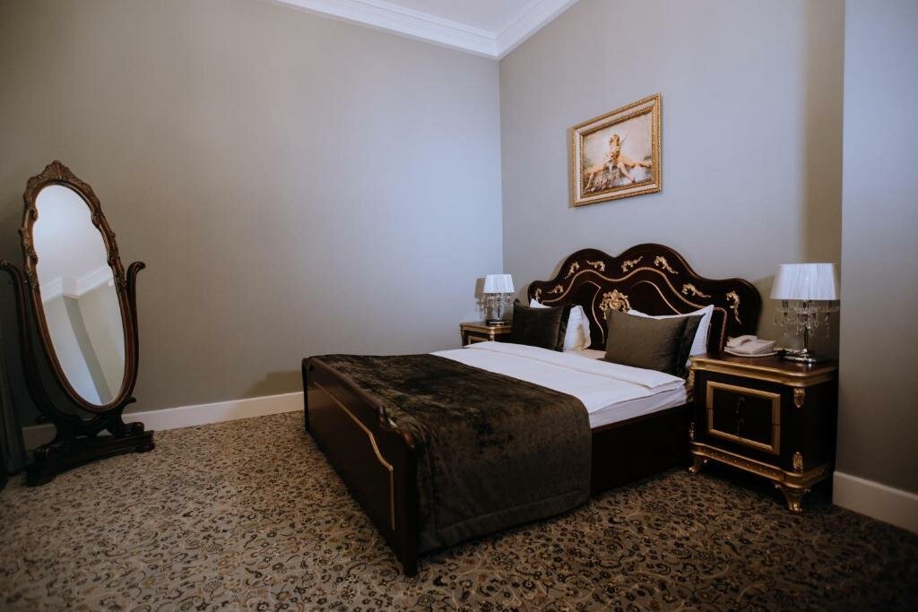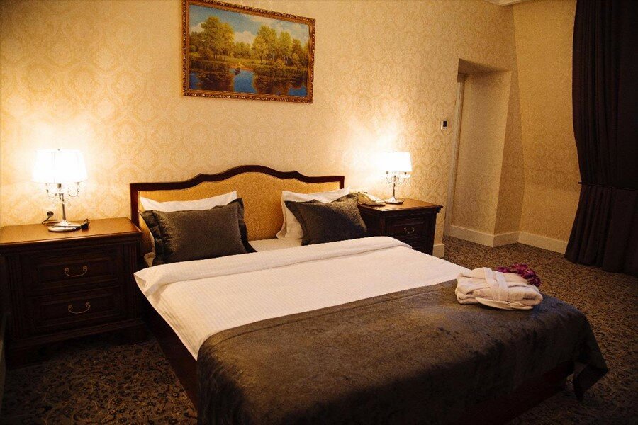 Отличная гостиница. Большие номера, прекрасная мебель, ванная комната по высшему разряду. В номере чайный набор, стаканы и вода в бутылочках, пополняемая каждый день. Чайник по запросу. Роскошный интерьер — хрусталь, позолота, вазоны с цветами. Завтрак очень разнообразный. горячие блюда — мясо и рыба. стандартные — сосиска, омлет, каши, мюсли. Блины, оладьи, сырники. Тарталетки с мелкой икрой, вероятно щучьей, балычок. Очень вкусная выпечка, особенно понравились круассанчики и маленькие пирожки с рыбой. Отличный кофе. Хороший бассейн средних размеров, со свежим ремонтом. Отличная сауна. В хамам не попали, он был на ремонте. От посещения отеля получили массу удовольствия, своих денег стоит. Единственный минус — парковка. Ее как таковой нет, Вся улица занята машинами посетителей кафе и супермаркета.