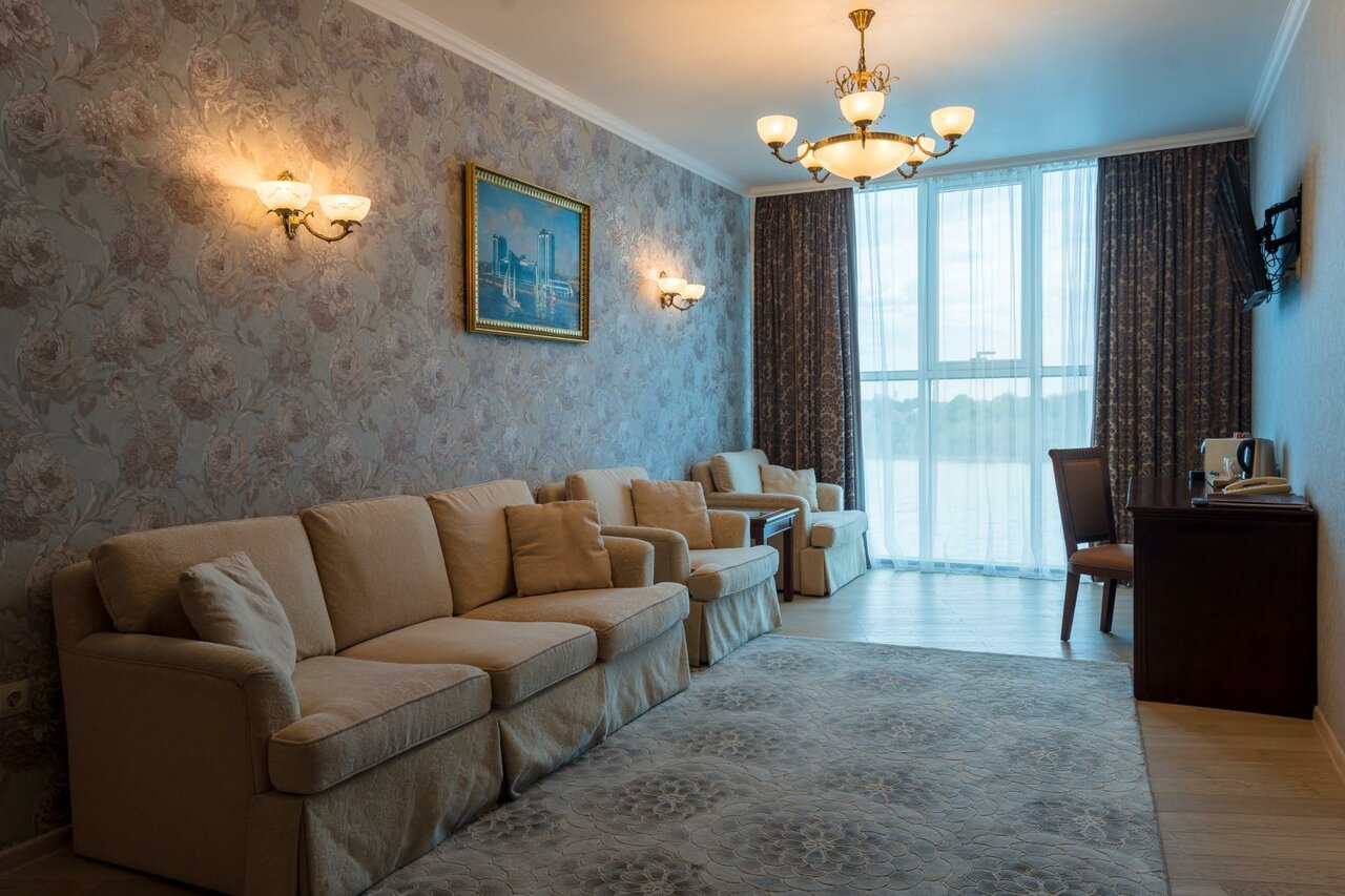 Из плюсов! Чай горячий бассейн сауна Волга река убирают в номерах хорошо полотенца халаты качественные!матрас удобный одеяло терлое и толстое ! В баре скудный прейскурант и кушать нечего кухни нет это печально товарищи!