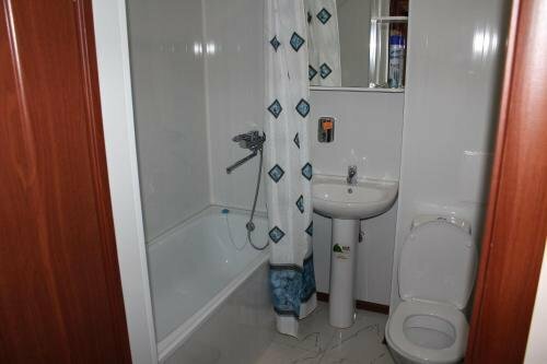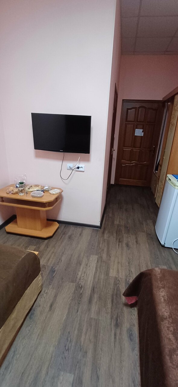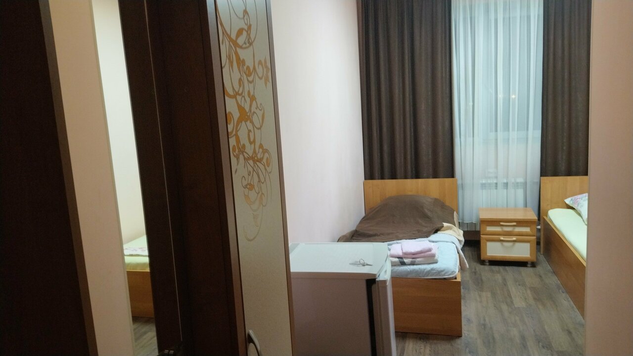 Гостиница очень хороша для посещения на пару-тройку дней. Номер небольшой, но чистый. В цену входит небольшой завтрак — бутерброд с сыром и колбасой вареной, йогурт и чокопай. Чай и кофе растворимый в свободном доступе в комнате-столовой. Там же стоит чайник и микроволновка. В номере их нет, но есть холодильник. Холодную и горячую питьевую воду можно взять из кулера рядом с ресепшеном Из минусов. Вход в гостиницу на втором этаже здания со ступеньками, далее после входной двери еще много ступенек к ресепшену. Нам достался номер на третьем этаже, тоже ступеньки) все бы ничего, но мы приехали с ребёнком, пришлось его на руках таскать, а коляску в машине оставлять, если бы приехали не на ней, тяжко бы пришлось. Мы остановились в этой гостинице на три ночи и за это время к нам ни разу не приходили помыть полы или вынести мусор Ну и не минус в принципе, а нюанс. Горячая вода из крана идёт не сразу, а надо сливать, в принципе, привыкнуть можно