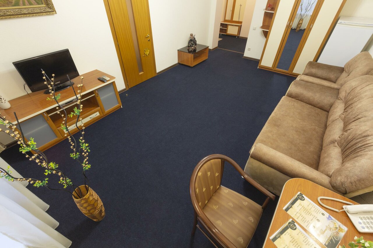 Просторный 2х комнатный номер ' Люкс' с большой кроватью King Size в отеле на Центральной Набережной Астрахани. Завтраки включены в стоимость проживания. Бесплатно чайный стол 24/7. Трансфер бесплатно* при длительном проживании от 7 ночей.