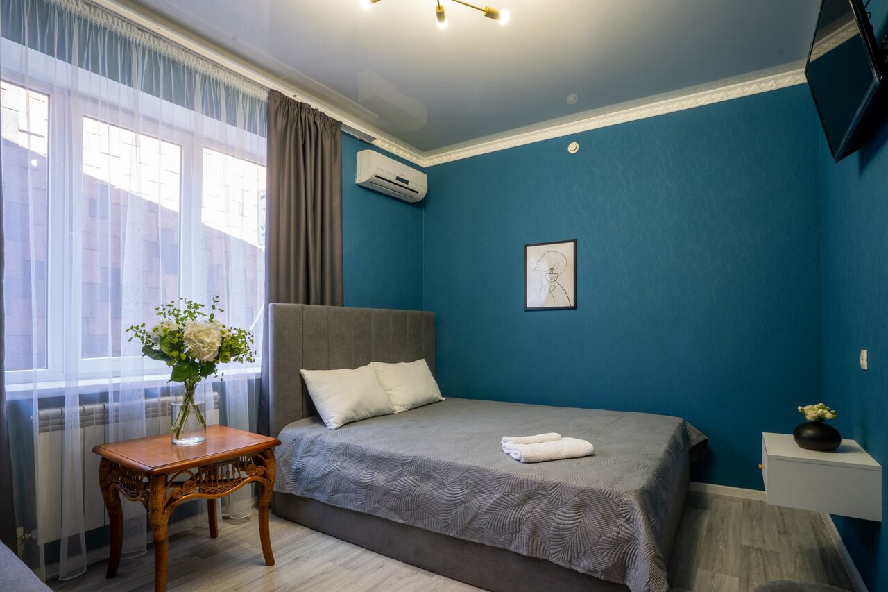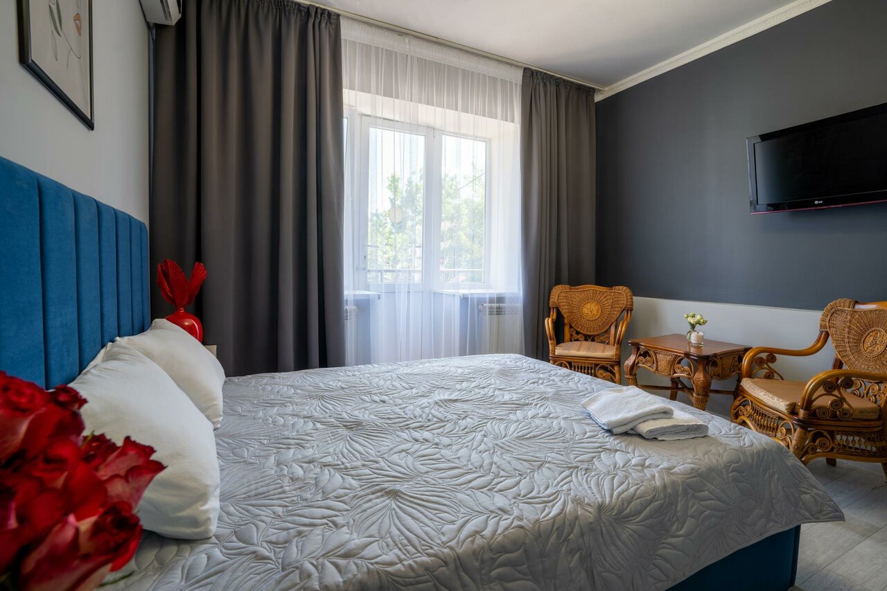 Одним словом-жуть! Останавливались на одну ночь перед важной сделкой.Совершенно не выспались-кровать и матрас из середины прошлого века,подушки каменные,белье серое со специфическим запахом. Батарея огненная,в комнате душно и жарко. Убогий санузел с неустойчивым унитазом и очень горячей водой ,до холодной надо сливать минут пять. На балконе невыключаемый фонарь светит прямо в комнату. Выбирали по фото,на самом деле все не так оказалось. Не советуем. Единственный плюс-расположение в центре города. Вспоминаем как страшный сон,как страшную ‘сказку’.
