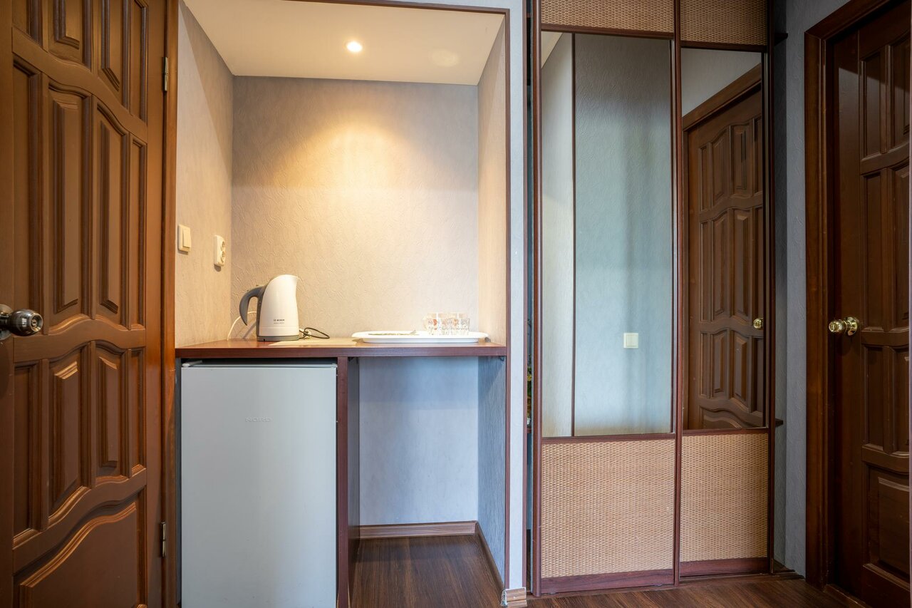 Одноместный однокомнатный номер, ванная комната с туалетом. Оснащение: телевизор, холодильник, чайник. В стоимость номера входит завтрак