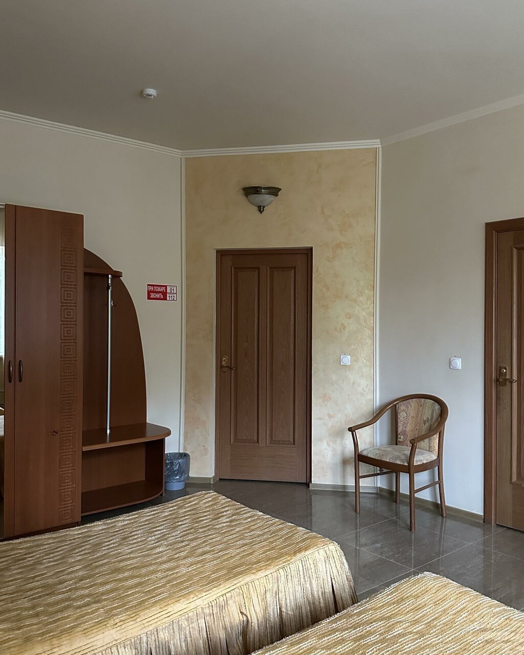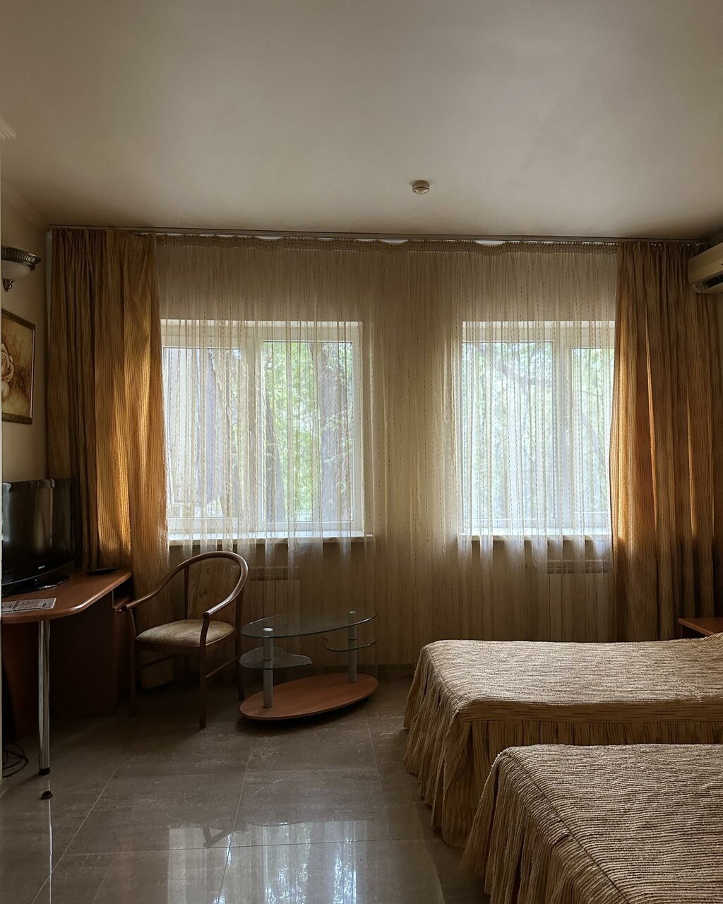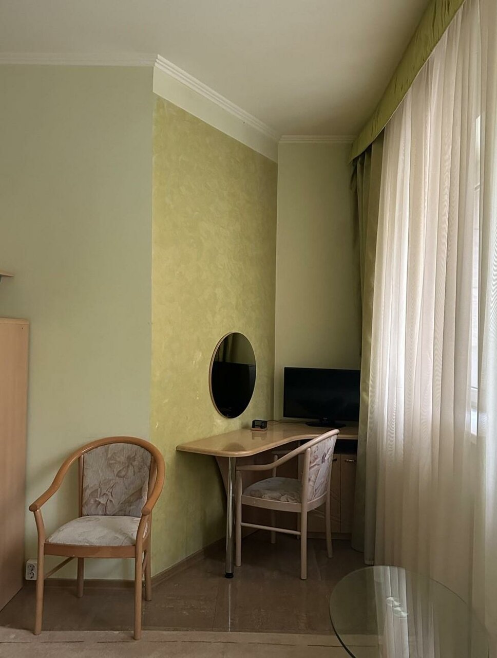 Бронировали на букинге. Номер соответствовал фото. Заявлены были халаты, но он был один. Комплект полотенец тоже один. Пришлось просить второй. Полотенца пахнут сыростью, прелым. В номере муж починил шкаф дверцу и кровать. В корпус куда нас поселили не было горячей воды на третий день отключили холодную. Нас переселили в первый корпус муж настроил телевизор ремонтировал штекер кабеля, снова пришлось просить полотенца и пододеяльник халатов, фена заявленых в букинге не было . В номерах за 5 дней ни разу не убирались. При заселении грязный унитаз, бычок за кроватью. За те деньги, что заплатили сервис соответствует. Вид из окон никакой. В номере есть холодильник.