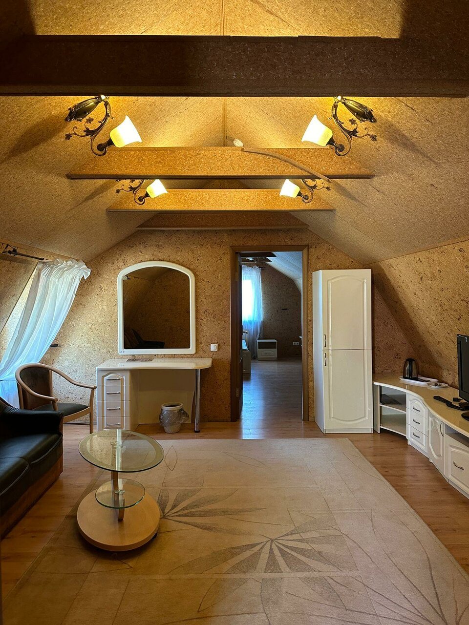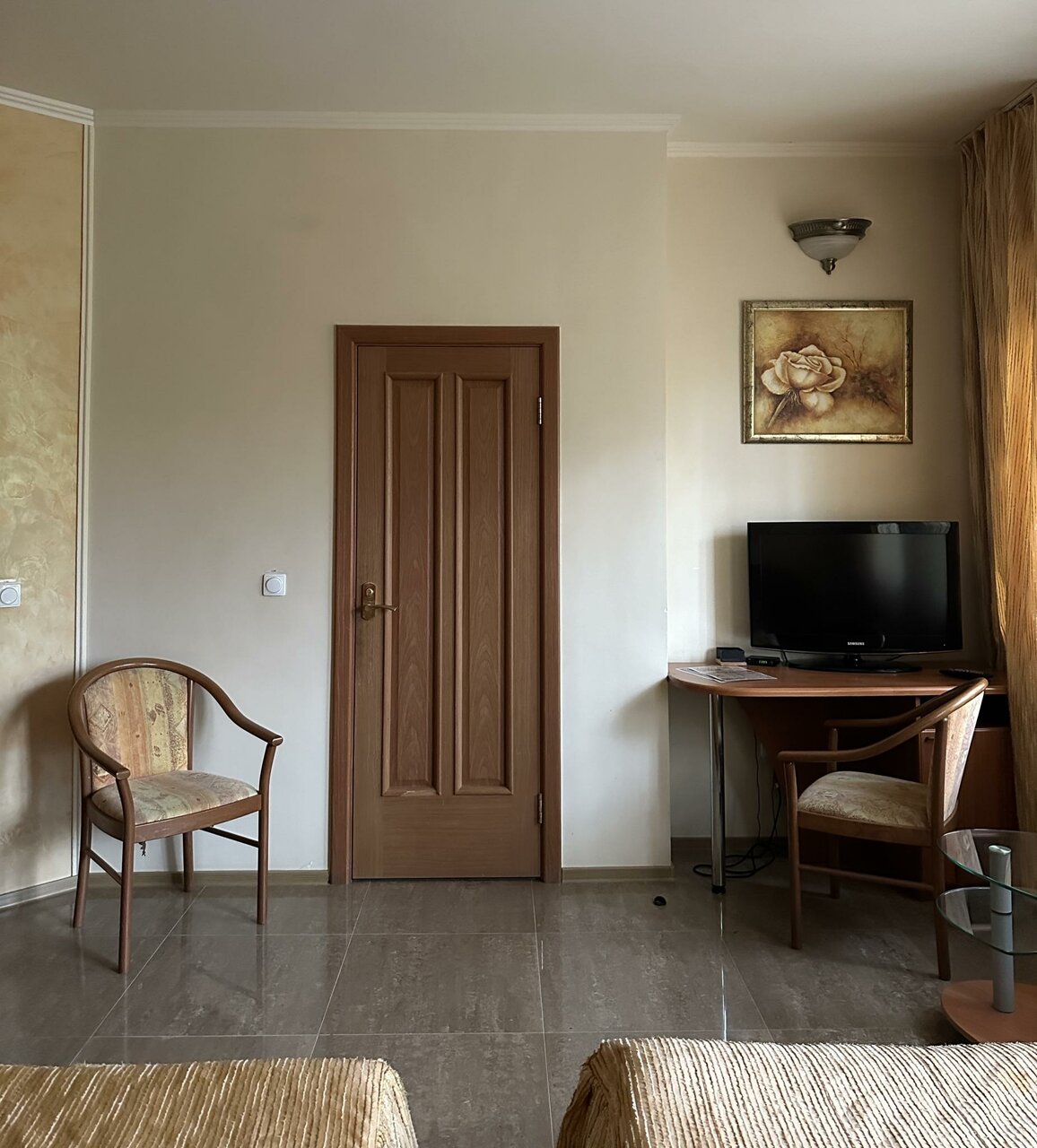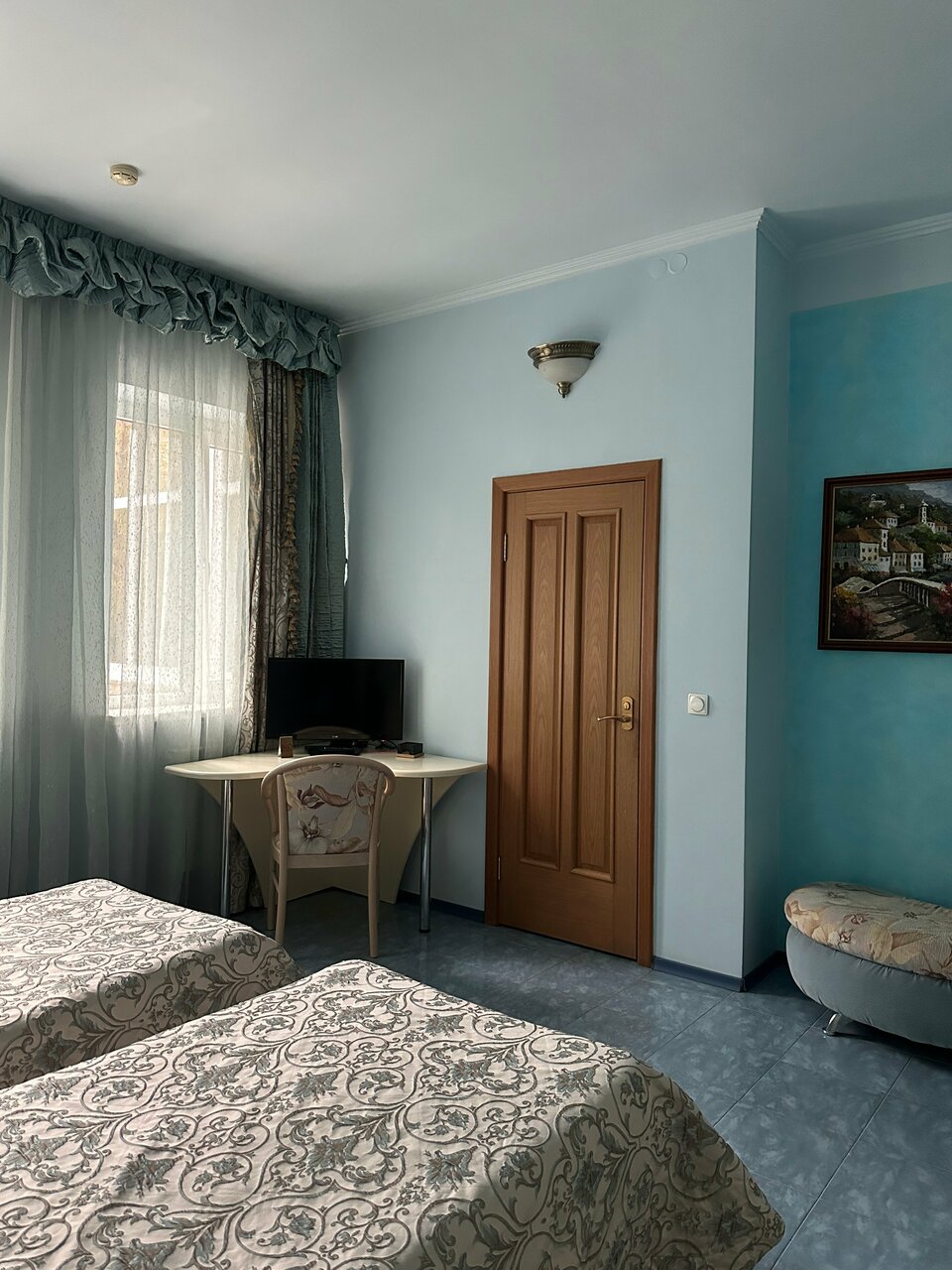 Бронировали на букинге. Номер соответствовал фото. Заявлены были халаты, но он был один. Комплект полотенец тоже один. Пришлось просить второй. Полотенца пахнут сыростью, прелым. В номере муж починил шкаф дверцу и кровать. В корпус куда нас поселили не было горячей воды на третий день отключили холодную. Нас переселили в первый корпус муж настроил телевизор ремонтировал штекер кабеля, снова пришлось просить полотенца и пододеяльник халатов, фена заявленых в букинге не было . В номерах за 5 дней ни разу не убирались. При заселении грязный унитаз, бычок за кроватью. За те деньги, что заплатили сервис соответствует. Вид из окон никакой. В номере есть холодильник.