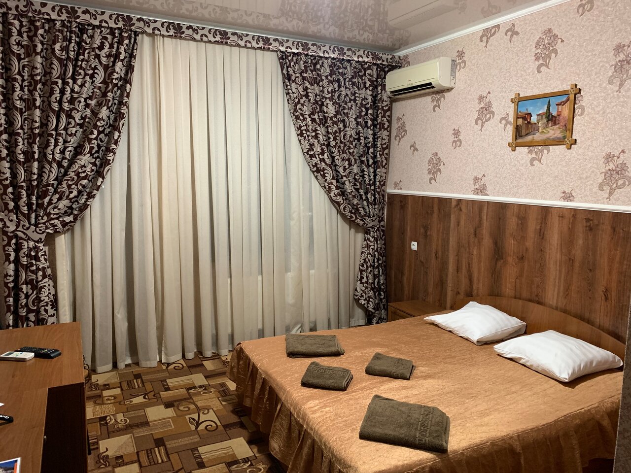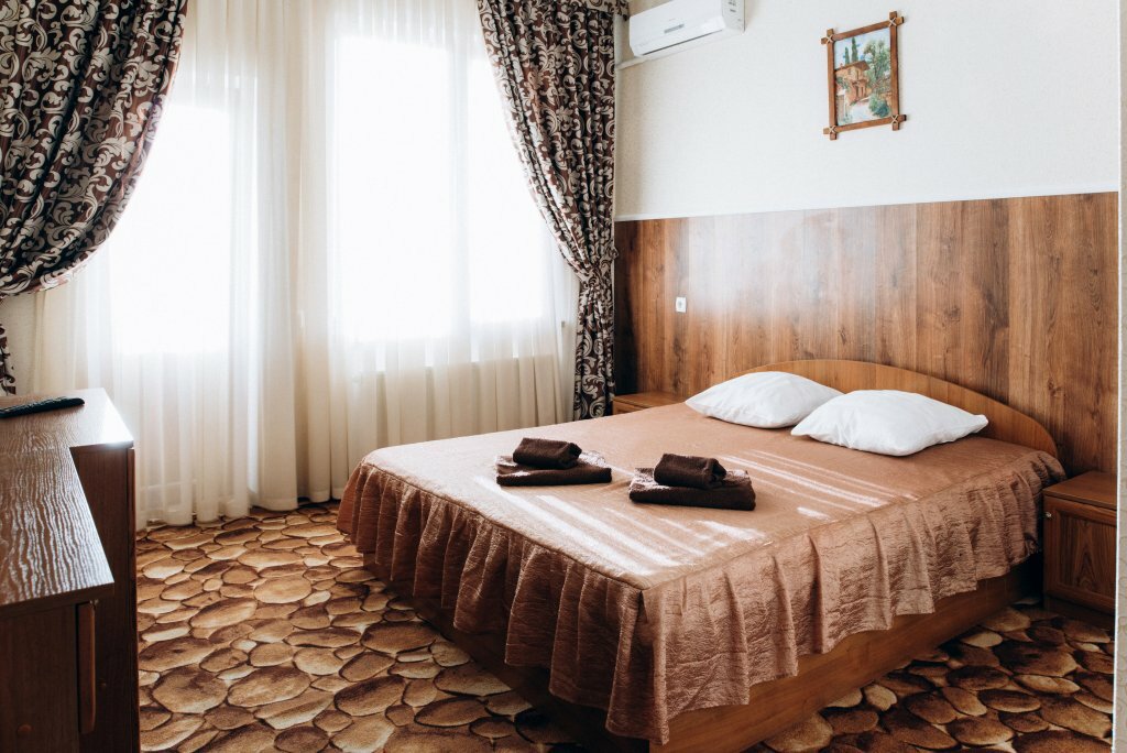 Уютный однокомнатный номер со всей необходимой мебелью, в котором могут разместится один или два человека, общей площадью 16-18 кв. м. Все необходимые условия в номере есть; санузел, банные принадлежности, спутниковое ТВ, кондиционер, WI-FI.
