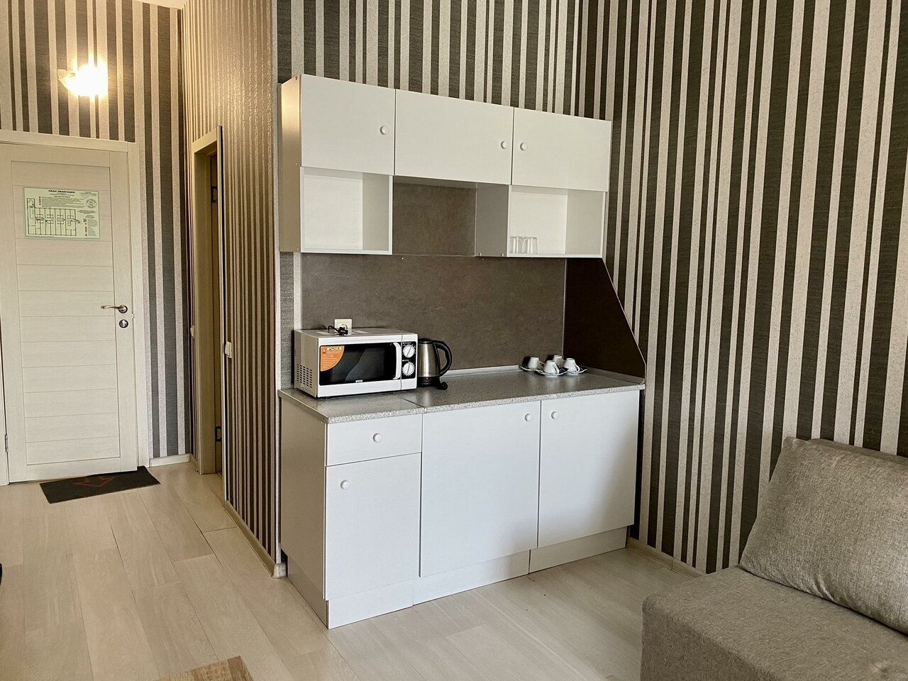 - Есть общая кухня, чайник, микроволновка, плита.
