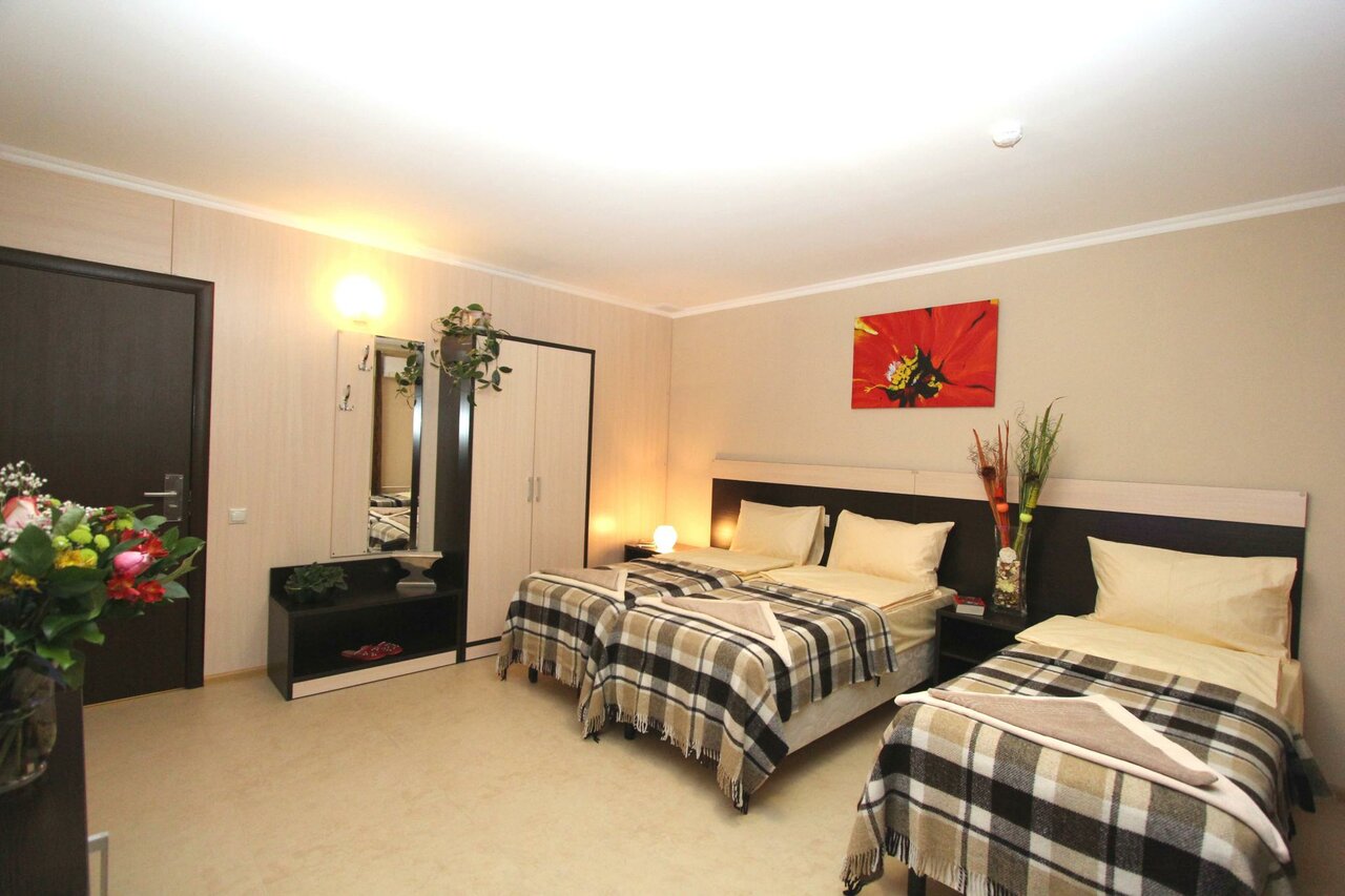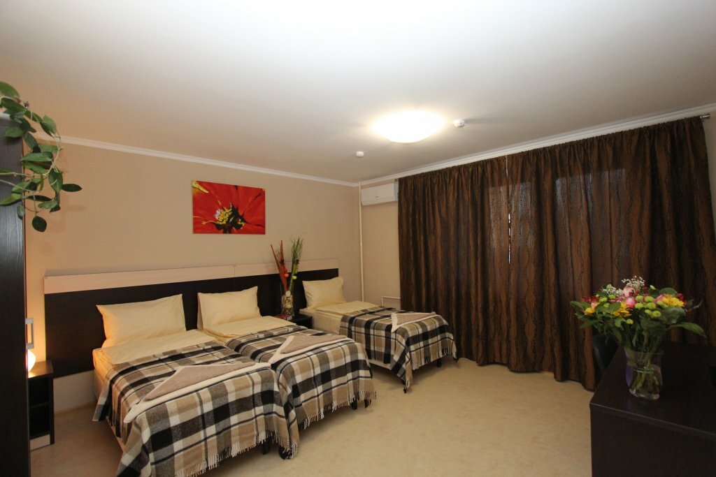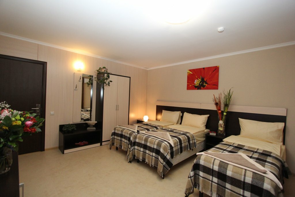 Комфортабельный двухместный номер с тремя раздельными кроватями. В номере есть выход на балкон, кондиционер, телевизор, холодильник, шкаф для одежды и банные принадлежности