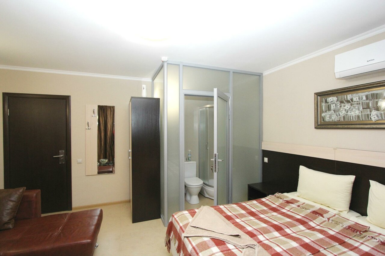 Персонал замечательный (в честь дня рождения заселили в Люкс с душем, ещё и 2 коробки конфет Рафаэлло подарили, золотунечки), номер комфортный, света и воздуха много, сама комната просторная, чистенькая, кровать мягкая (есть все удобства: рабочий мини-холодильник, кондиционер, пледы, стаканы под напитки)