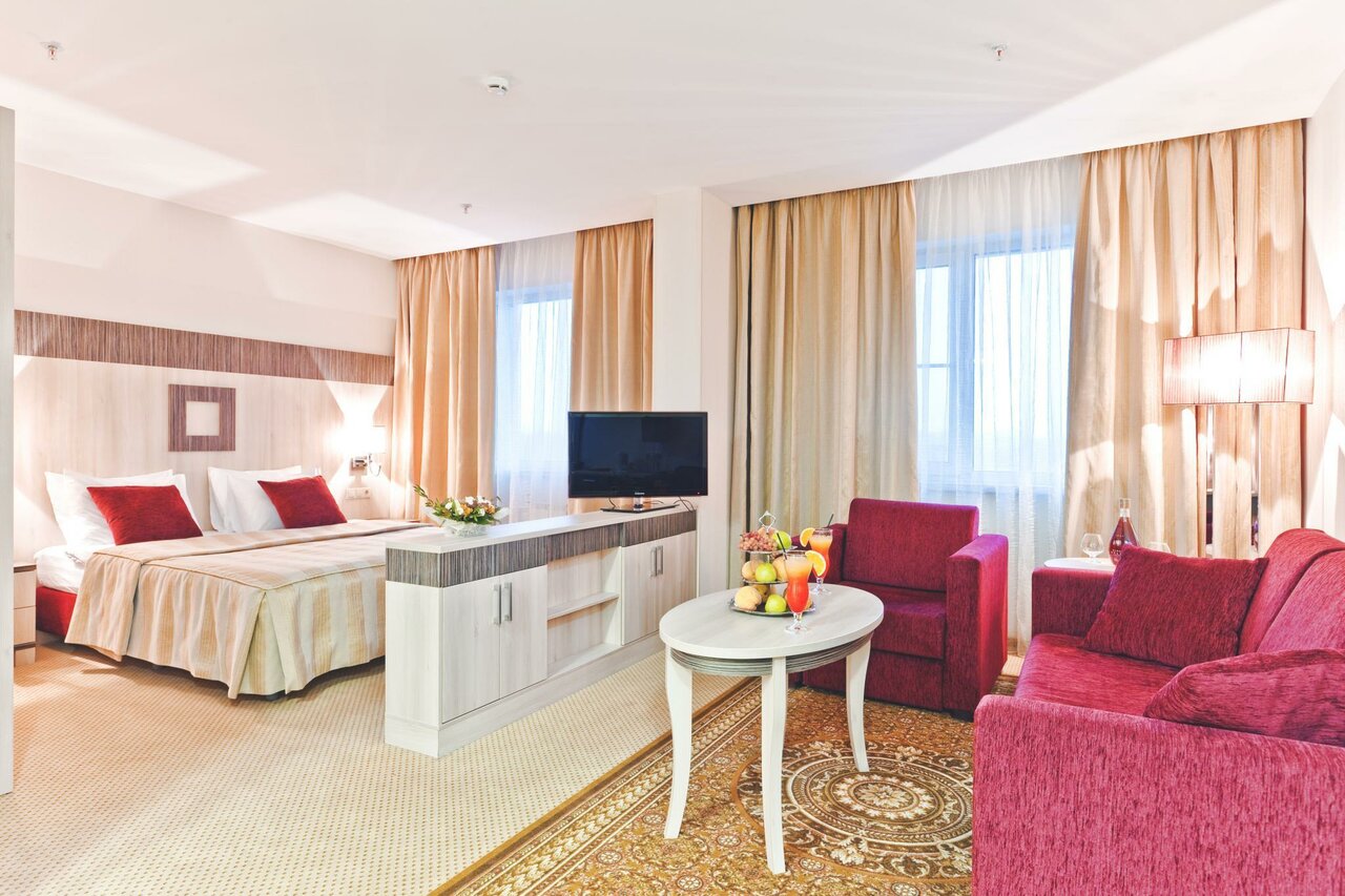 Просторный роскошный номер категории DELUX или STUDIO.Пакет включает:Номер с поздним выездом до 16.00Завтрак в ресторане «Vitello» (с 7.00 до 11.00) Украшение шарамиШампанское