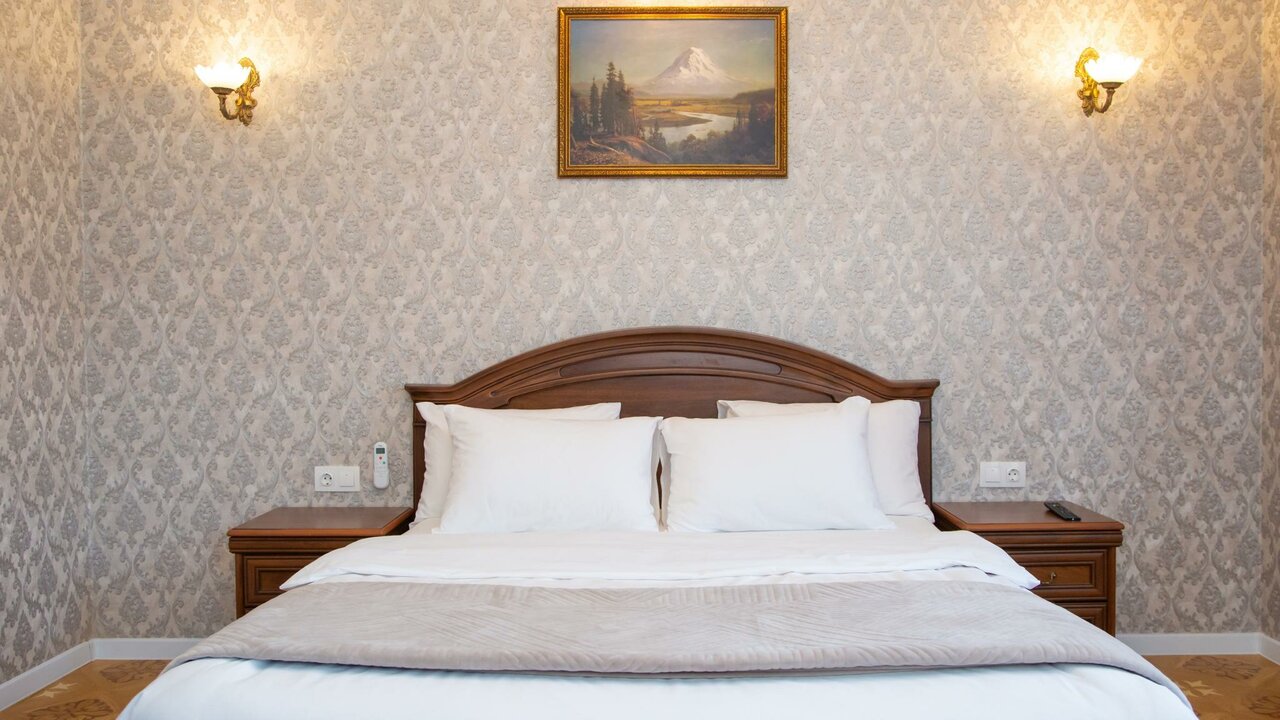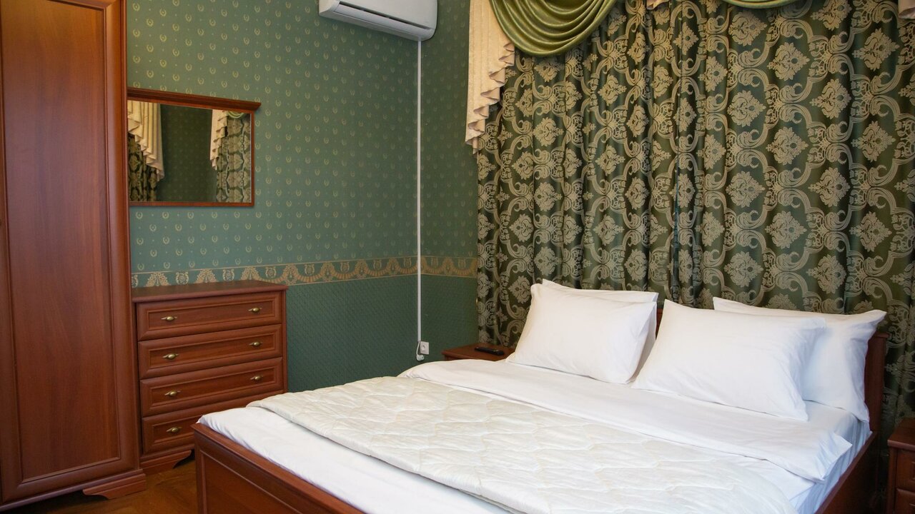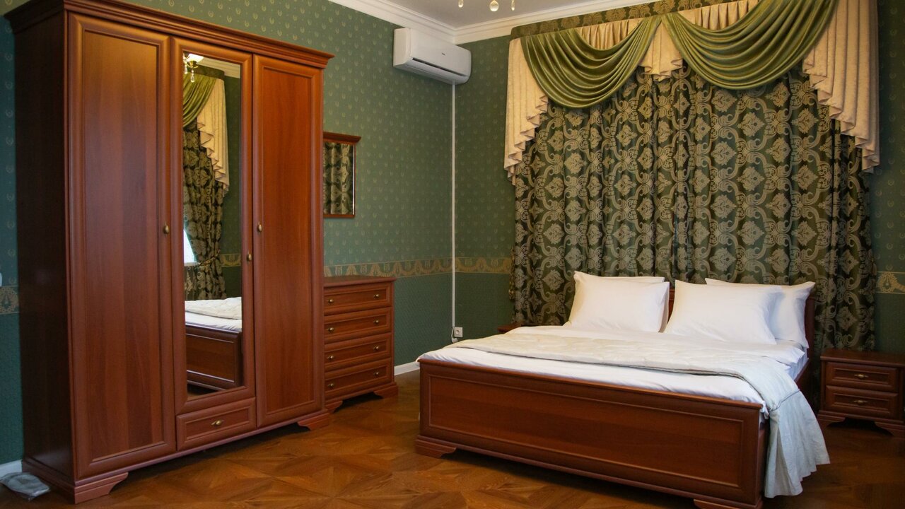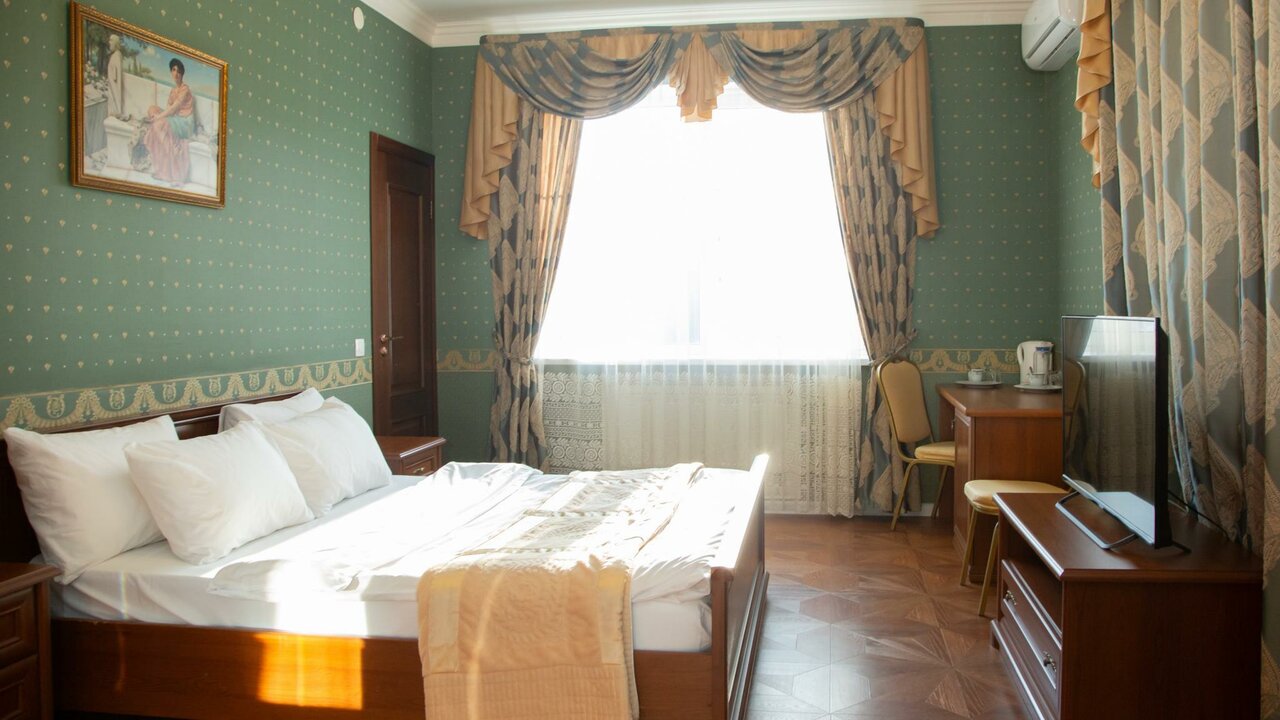 Однакомнатный номер с одной двухспальной кроватью площадью 30 кв. метров исполненый в классическом стиле.