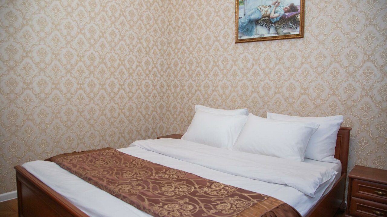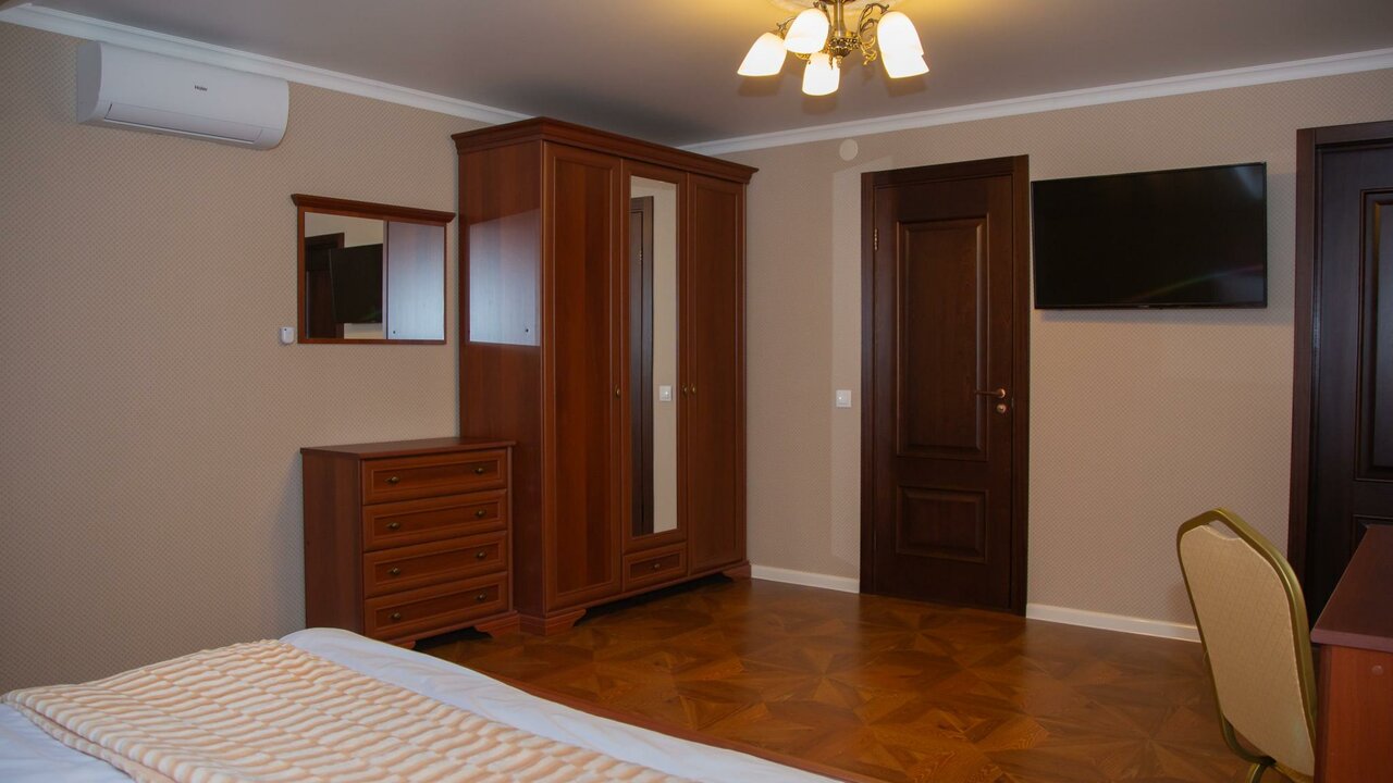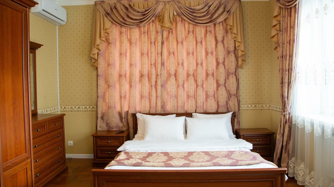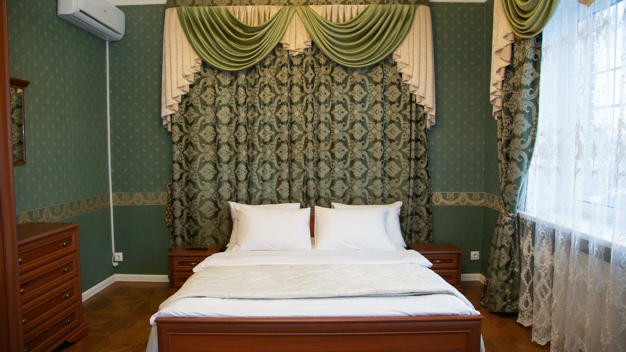 Однакомнатный номер с одной двухспальной кроватью площадью 30 кв. метров исполненый в классическом стиле.