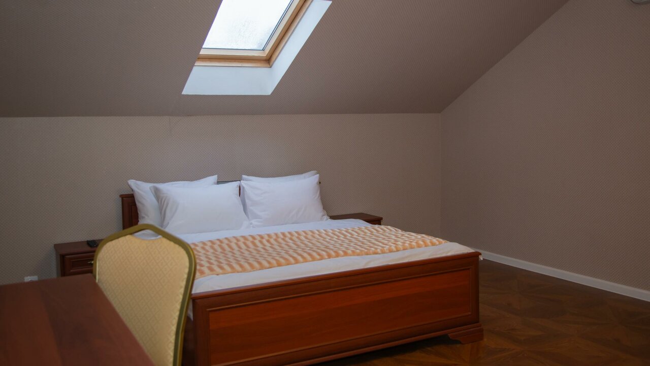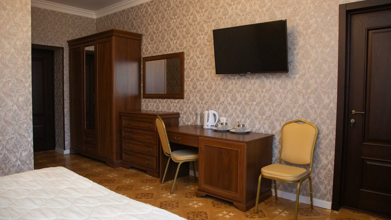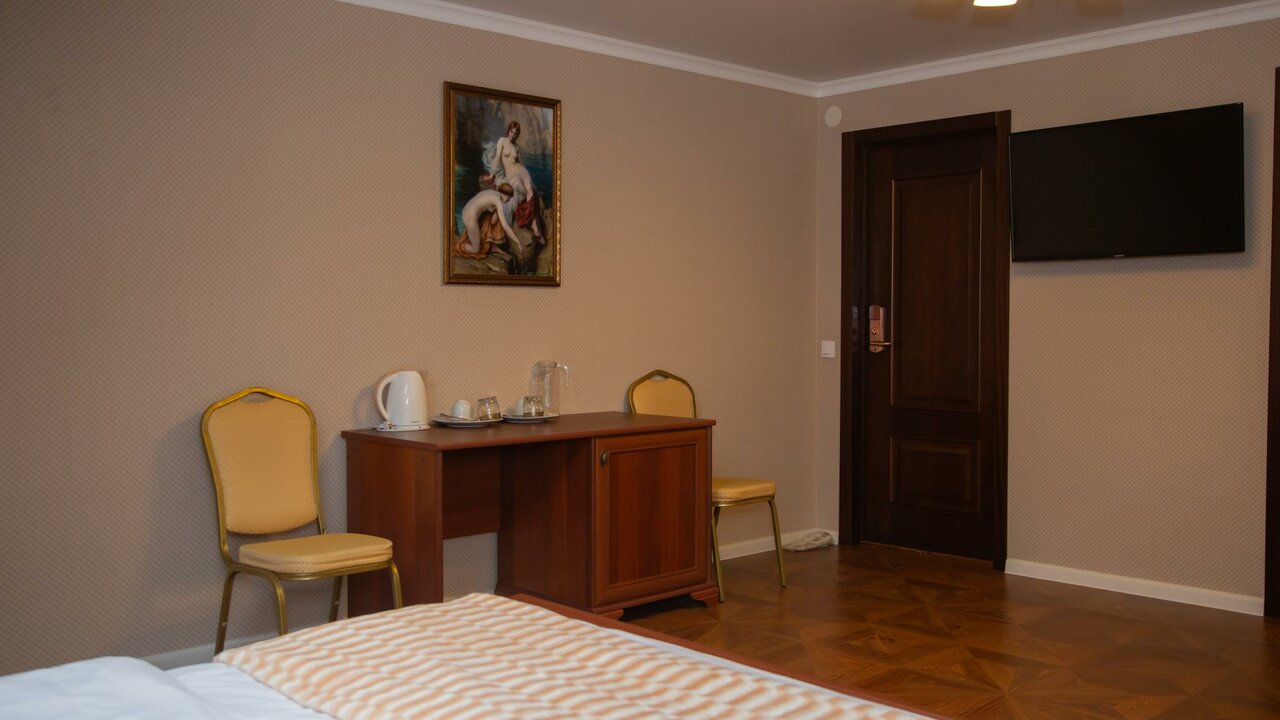 Однакомнатный номер с одной двухспальной кроватью площадью 30 кв. метров исполненый в классическом стиле.Удобства: Санузел, включая ванну 170 x 75 см.Гель для душа.Шампунь.Фен.Фригобарный стол.Полотенца: 6 шт.Холодильник Чайные приборы