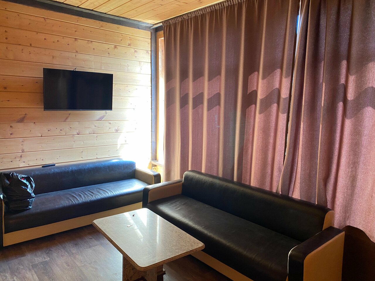 Номер комфорт с большой двуспальной кроватью и двумя односпальными кроватями, большим телевизором, столиком, душевой кабиной в номере, тапочками, моющими принадлежностями, полотенцами.