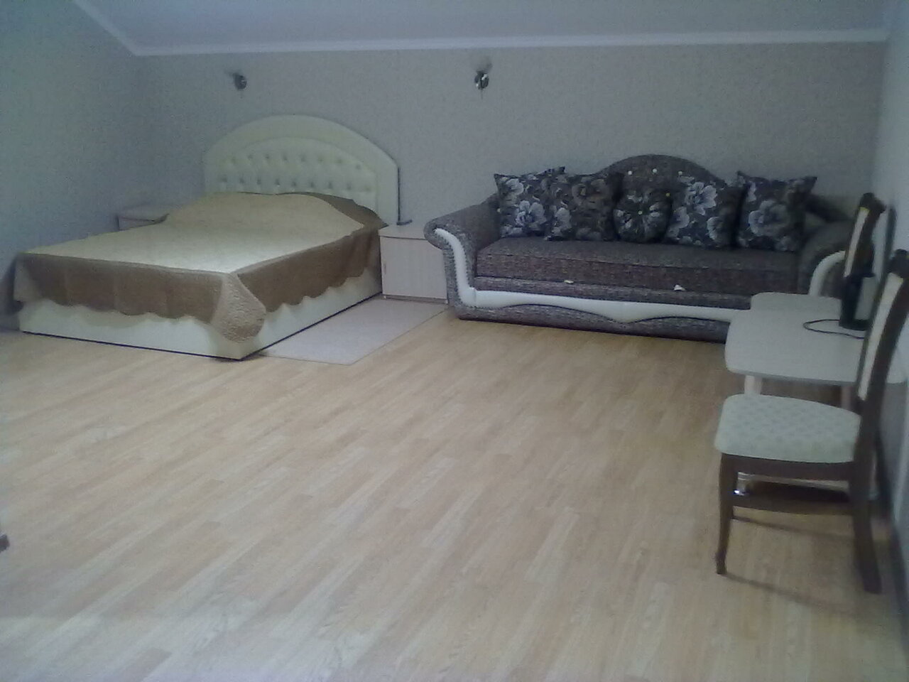 Самая дешёвая мебель, столетний матрас на кровати, душ со сливом в полу — это так называемый ‘люкс’ в этой гостинице. Страшно представить, как выглядит номер ‘стандарт’. Купаться предлагают мылом для рук- ни геля, ни шампуня в душе нет