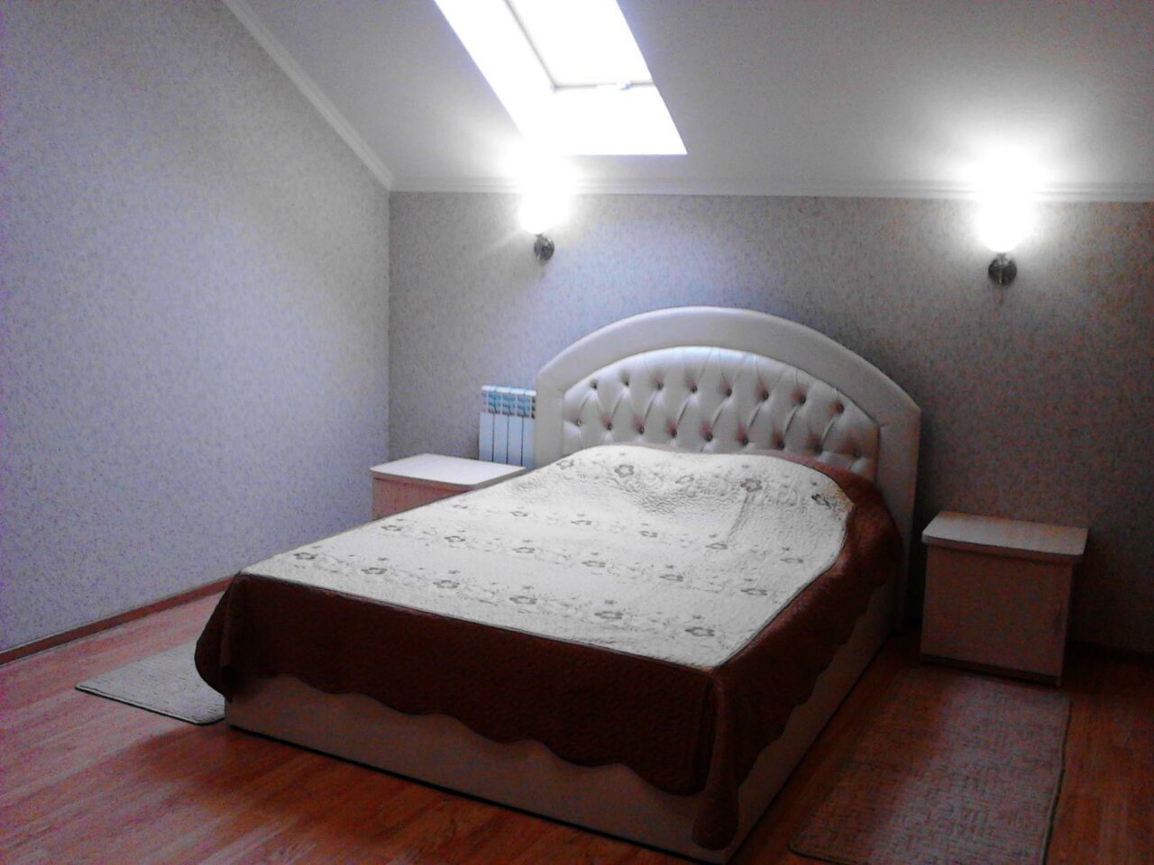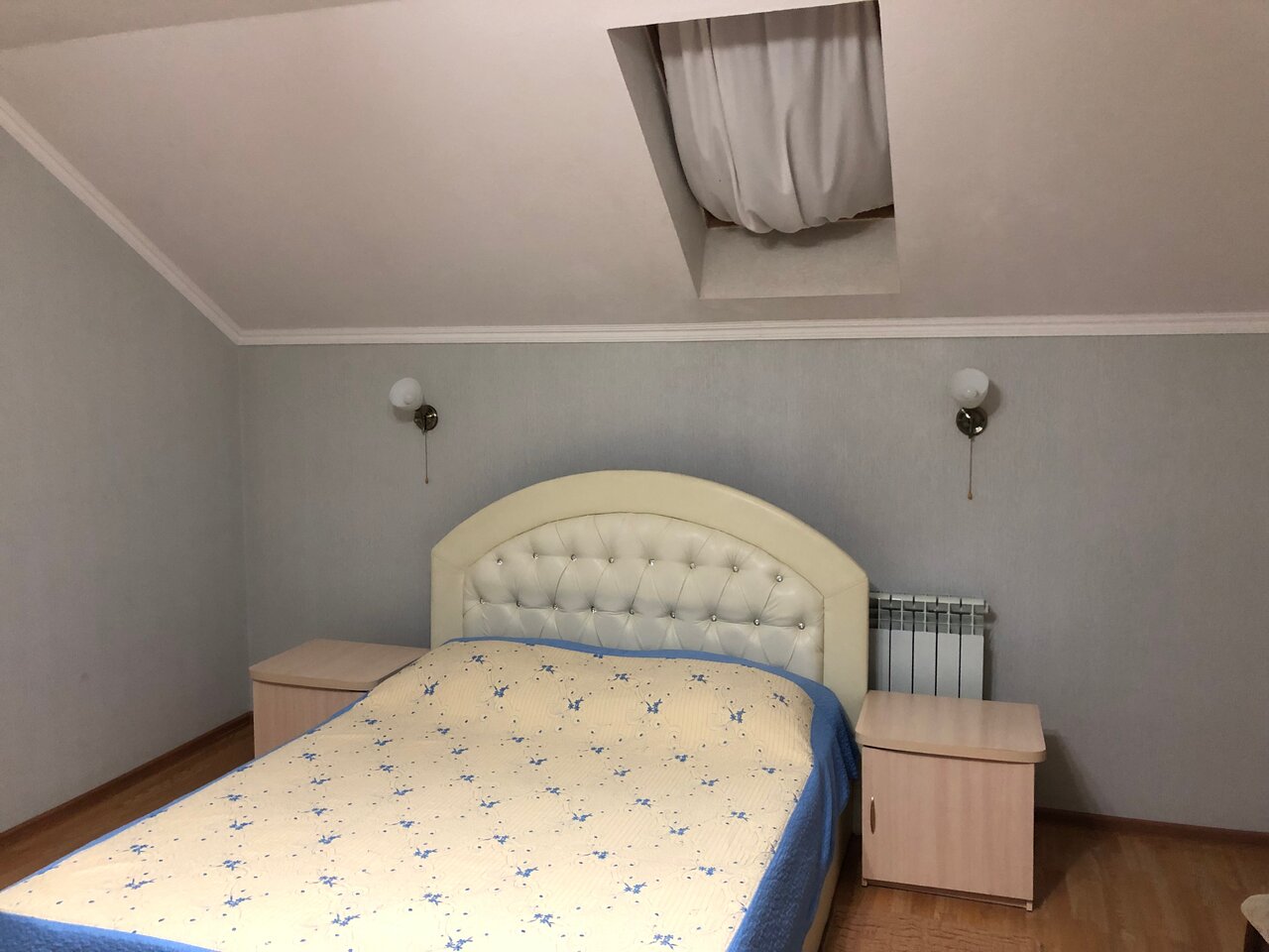 Номер на мансардном этаже с двуспальной кроватью и диваном, оборудован всем необходимым для отдыха.