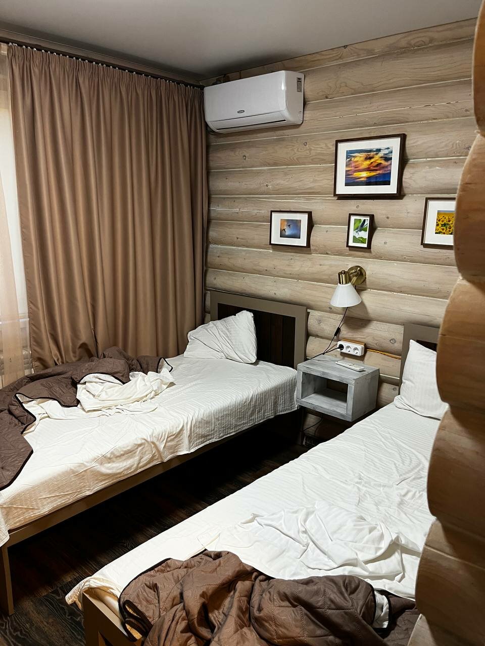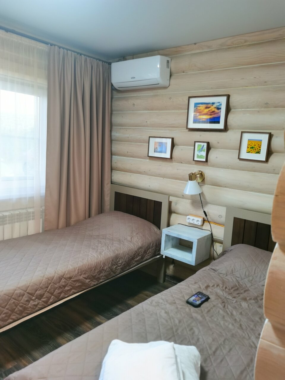 Двухместный номер со всеми удобствами. Туалет, душ, фен, холодильник, телевизор. С возможностью размещения до трёх человек.