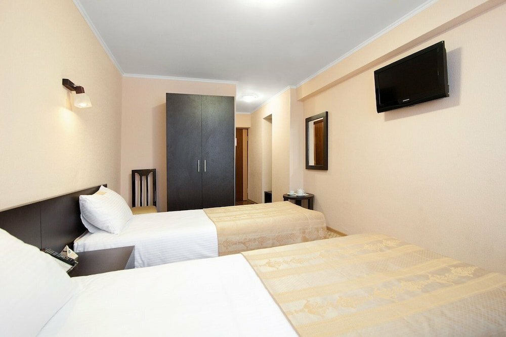 Отель сильно разочаровал. В номерах, на 3-м этаже, надо ложиться спать в режиме работы ресторана: звукоизоляция никакая, слышимость — отличная. Полотенцесушитель работает только если включить горячую воду, иначе — холодный. Воду, чтобы стала горячей, надо сливать 5-10 минут. В номере холодно, даже при небольшом минусе на улице. Телевидение в отеле — эфирное, не цифровое, с низким качеством. Не показывают даже некоторые федеральные каналы. Кровать, в номере ‘ Стандарт’ — узкая, не для человека крупного телосложения. Не поместиться. Больше я туда приезжать не буду, с лихвой хватило двух раз!