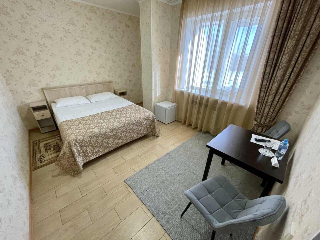 Уютно, но умеренно как по цене, так и по обстановке. Холодильника в номере нет, но могут принести. Кафе при гостинице нет, готовят только завтраки. Ближайшие кафешки в километре, как раз аппетит нагулять.