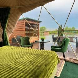 Домик шикарный! Внутри есть всё для отдыха: небольшая кухня с посудой, холодильник, стол, стулья, диванчики. Пол тёплый. На втором этаже кровать. В ванной бумага, гель для душа, зубная щётка, паста, полотенца, шампунь. Чистота необычайная! Веранда шикарная: стол, стулья, качалка. Банный чан. Вид на озеро бесподобный! Минус. Это на мой взгляд. Очень жарко. Оставаться ночевать не решились, потому что очень жарко было. Хотели сдать домик в 3 утра, оказалось, что никого из администрации или дежурного нет. Такой шикарный комплекс без какого-то (извините за посторечье) пригляда. Уехали домой. В 11 утра пришлось вернуться, чтобы сдать домик и ключи. Ещё всем рекомендую не трогать ничего в холодильнике. За это придётся платить И немало.