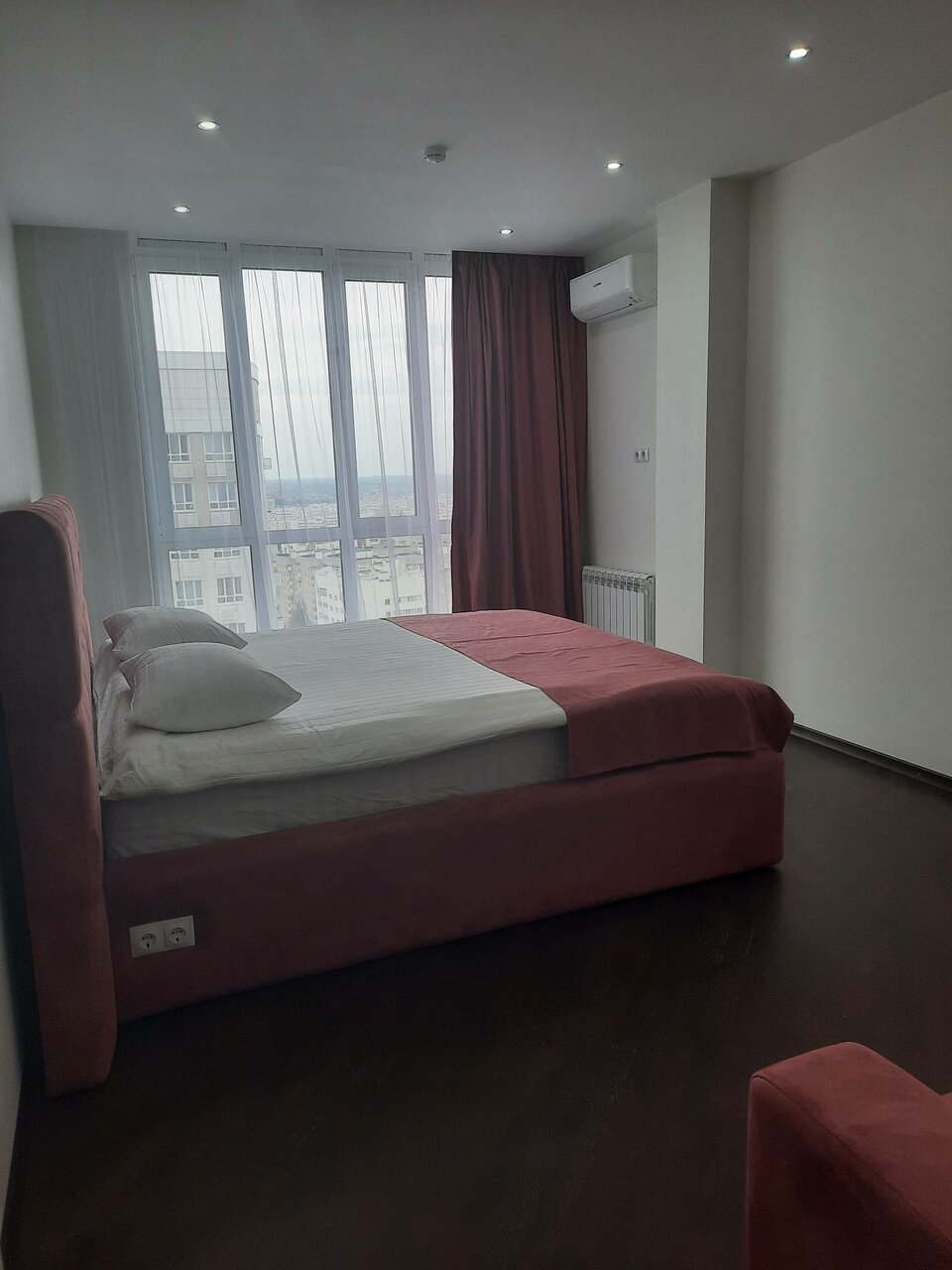 Насыщенные яркие тона, современный ремонт, панорамный вид на город. Две спальни и кухня.