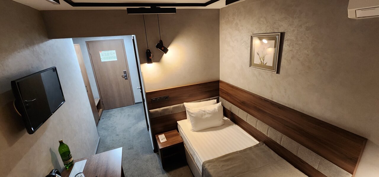 Гостиница новая, персонал приветлив, всё чистенько. Брал одноместный номер — это #2 в списке микрономеров в которых я останавливался — примерно 10-12м2. Заявлено 4*. Считаю цену не обоснованно высокой за такую площадь номера. Завтрак шведский стол- нормальный. Рядом есть где прогуляться