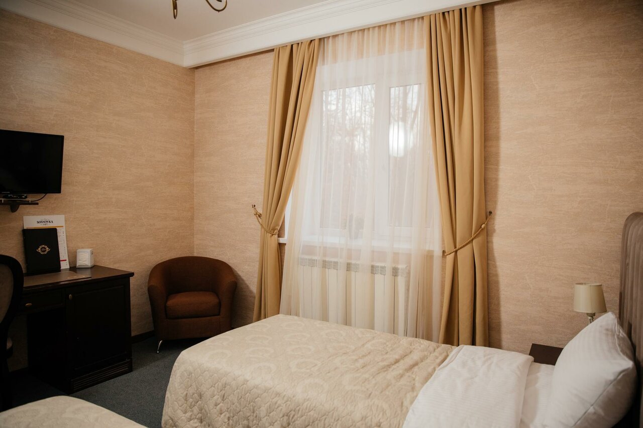 Отель понравился. Хороший интерьер, приветливые сотрудники, обстановка в номере современная, хорошее белье, все необходимое, полотенца, фен, гигиенические принадлежности, имеется. Красивая, ухоженая территория в сосновом лесу, чудесный воздух. Тут же имееся ресторан. И все это в пяти минутах от города. Убрала одну звезду за то, что за время проживания , шесть дней, ни разу не было уборки. Но если придется, остановлюсь там же.