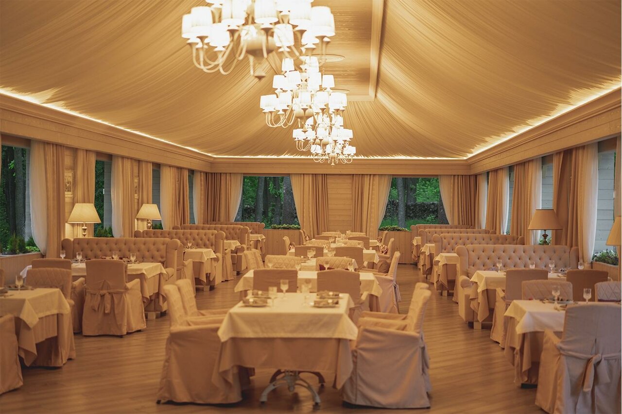 Отличное заведение, персонал на высоком уровне, шикарное расположение среди леса соснового, чистый воздух. Сами с Липецка, отмечали свадьбу близкого человека, машину оставили на большой парковке, бесплатно!